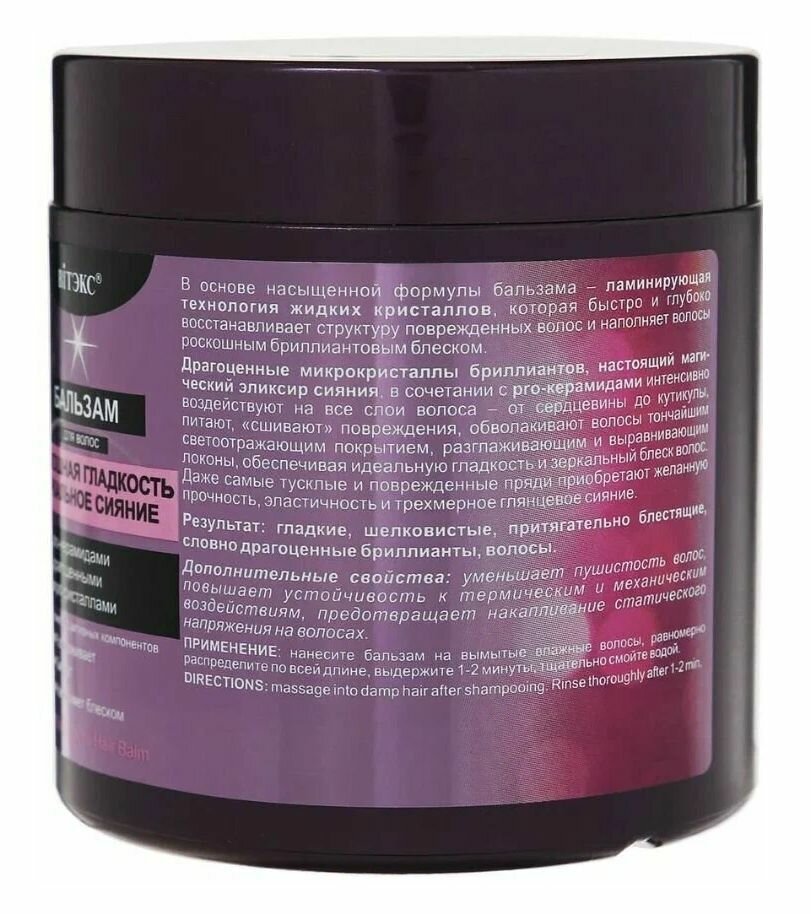 В основе насыщенной формулы бальзама – ламинирующая технология жидких кристаллов, которая быстро и глубоко восстанавливает структуру поврежденных волос и наполняет волосы роскошным бриллиантовым блеском.