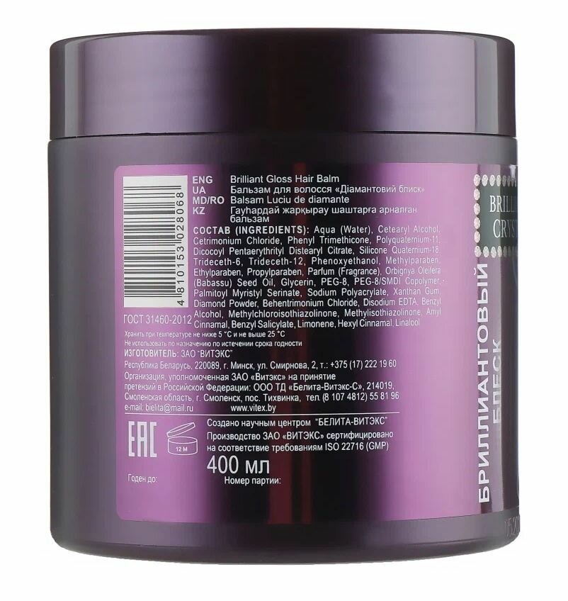 | Состав | вода, цетеариловый спирт, хлорид цетримония, фенилтриметикон, поликватерниум-11, дикокоилпентаэритритилдистеарилцитрат, силикон кватерниум-18, тридецет-6, тридецет-12, феноксиэтанол, метилпарабен, этилпарабен, пропилпарабен, ППГ-3 каприлиловый эфир, парфюмерная композиция, масло семян Orbignya Oleifera (бабассу), глицерин, ПЭГ-8, сополимер ПЭГ-8 / СМДИ, пальмитоилмиристилсиринат, полиакрилат натрия, ксантановая камедь, порошок алмаза, хлорид бегентримония, ЭДТА динатрия, бензиловый спирт, метилхлоризотиазолинон, метилизотиазолинон, лимонная кислота, амилциннамаль, бензилсалицилат, лимонен, гексилциннамаль, линалол |