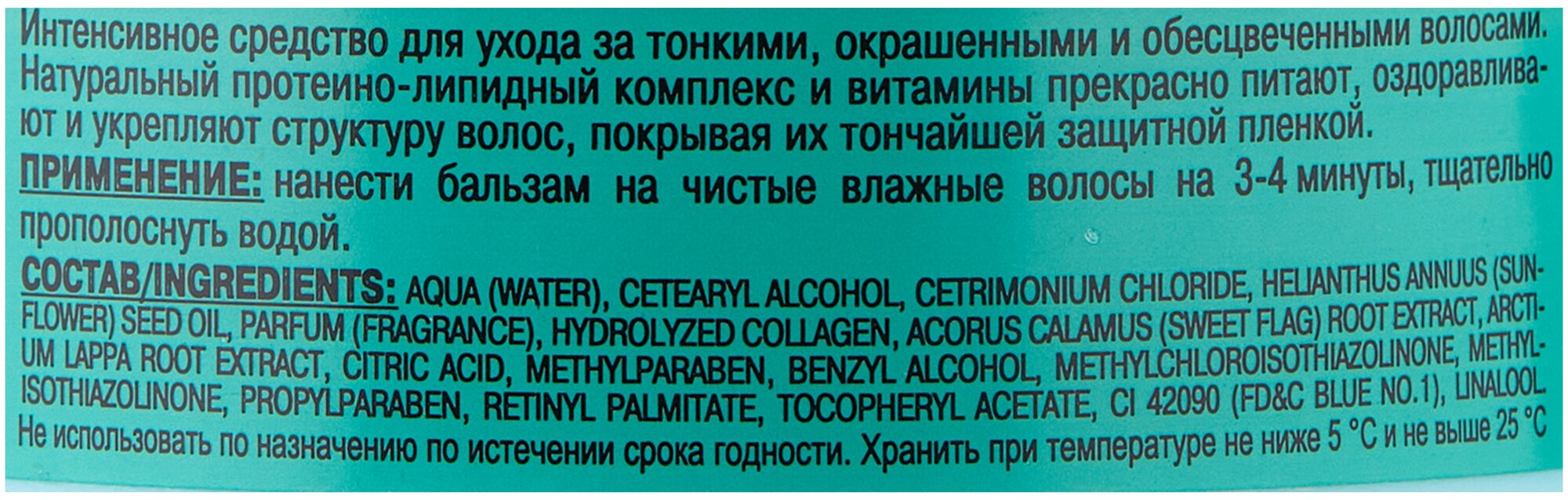 | Состав | вода, цетеариловый спирт, хлорид цетримония, масло helianthus annuus (подсолнечное), парфюмерная композиция, парфюмерная композиция, экстракт корня arctium lappa (лопуха), экстракт acorus calamus (аира), гидролизат коллагена, кислота лимонная, метилпарабен, бензиловый спирт, метилхлоризотиазолинон, метилизотиазолинон, пропилпарабен, токоферилацетат, ретинилпальмитат, ci 42090 |