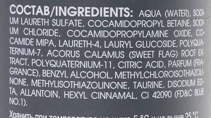 | Состав | вода, лауретсульфат натрия, кокамидопропилбетаин, кокамидопропиламиноксид, хлорид натрия, кокамид mipa, лаурет-4, лаурилглюкозид, кокамидопропилбетаин, поликватерниум-7, экстракт acorus calamus (аира), поликватерниум-11, парфюмерная композиция, кислота лимонная, бензиловый спирт, метилхлоризотиазолинон, метилизотиазолинон, таурин, эдта динатрия, аллантоин, ci 42090, гексилциннамаль |