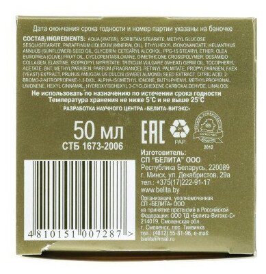 | Состав | вода, сорбитан стеарат, метилглюкозы сесквистеарат, масло вазелиновое, масло растительное, глицерин, этилгексилэтилгексаноат, ппг-15 стеариловый эфир, цетеариловый спирт, масло оливковое, циклометикон, диметикон кроссполимер дезамидоколлаген, эластин, экстракт дрожжей, экстракт миндаля, ретинол пальмитат (витамин а), масляный экстракт зародышей пшеницы, токоферил ацетат, bht, изопропилмиристат, кислота лимонная, парфюмерная композиция, метилпарабен, пропилпарабен, 2-бром-2-нитропропан-1, 3-диол |