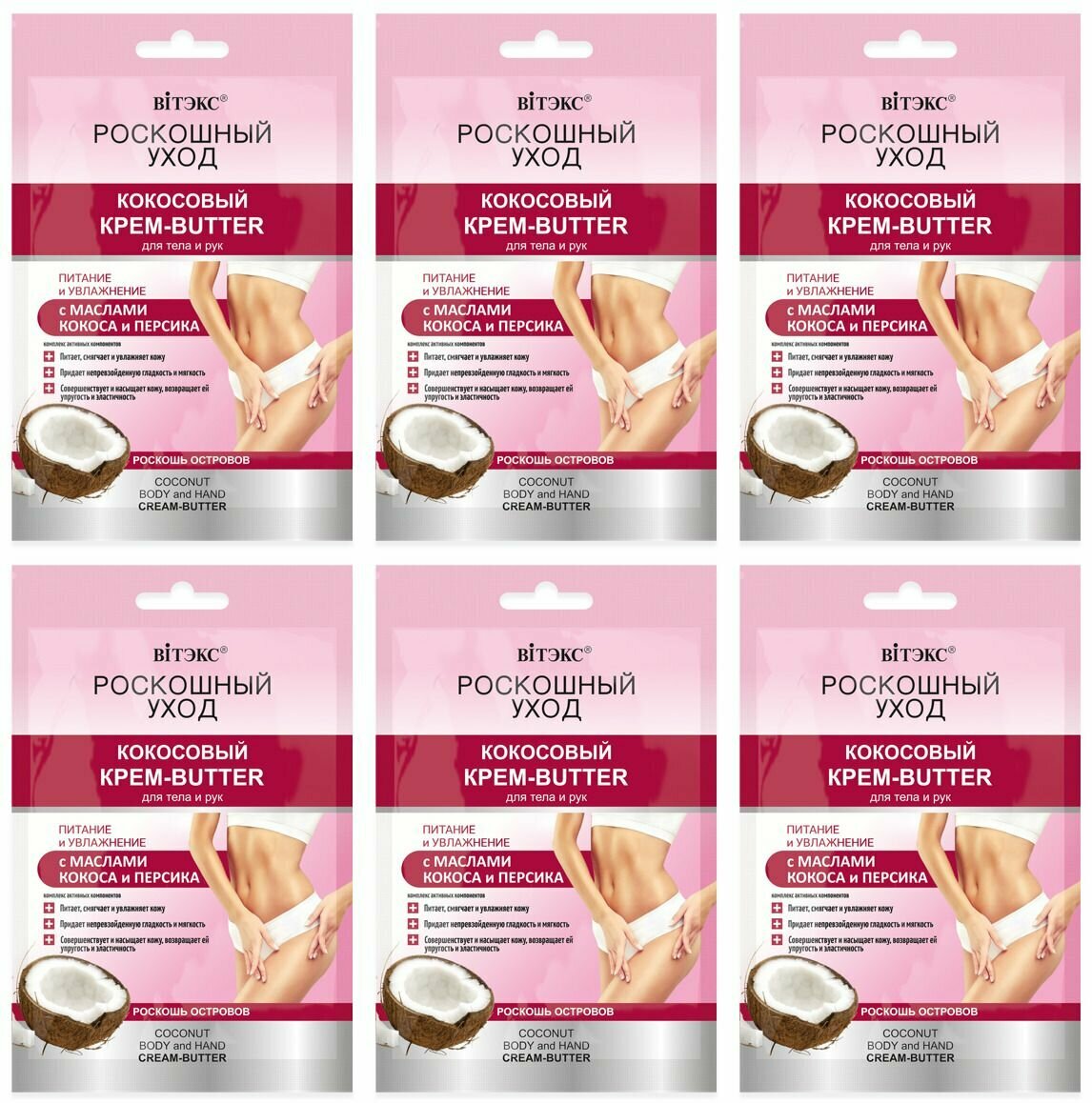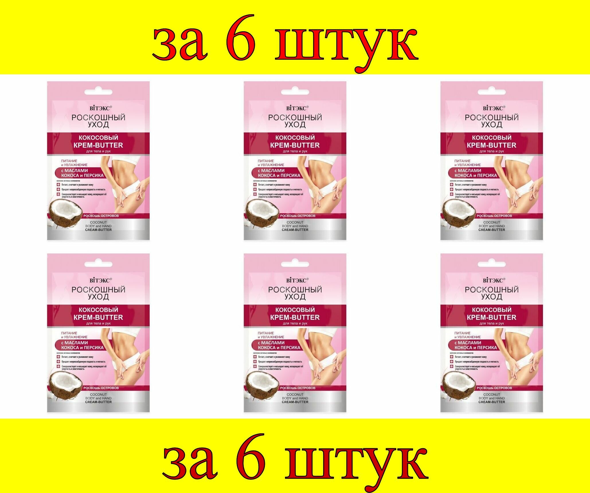 Кокосовый крем-butter для тела и рук с маслом кокоса и райский гибискусом – изысканное наслаждение для Вашей кожи. Обворожительно роскошная текстура нежно тает, прекрасно питает, смягчает и увлажняет кожу, возвращает ей упругость и эластичность.Живая энергия масла кокоса обогащает клетки ценными элементами, снимает шелушение и раздражение кожи, дарит непревзойденную гладкость, мягкость и шелковистость.Экстракт райского гибискуса насыщает клетки необходимой влагой, улучшает тонус кожи, обеспечивает антиоксидантную защиту, придает нежность и сияние.Завораживающий гавайский уход, которым Вы не перестаете наслаждаться каждый день! В комплекте 6 шт