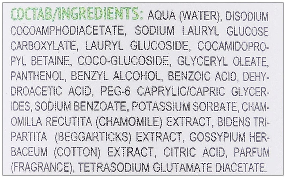 | Состав | Вода; кокоамфодиацетат динатрия; натриевая соль карбоксилата лаурилглюкозы; лаурилглюкозид; лаурилглюкозид; кокамидопропилбетаин; ПЭГ-6 глицерилкаприлат/капрат; кокоглюкозид; глицерилолеат; пантенол; бензиловый спирт; бензойная кислота; дигидроуксусная кислота; бензиловый спирт; бензоат натрия; сорбат калия; экстракт Chamomilla Recutita (ромашки); экстракт Bidens Tripartita (череды); экстракт Gossypium Herbaceum (хлопка); кислота лимонная; глутамат диацетат тетранатрия; парфюмерная композиция; < 0,01 % аллергенов) |