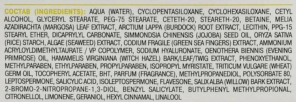 | Состав | aqua (water), cyclopentasiloxane, cyclohexasiloxane, cetyl alcohol, glyceryl stearate, peg-75 stearate, ceteth-20, steareth-20, betaine, melia azadirachta (margosa) leaf extract, arctium lappa (burdock) root extract, lecithin, ppg-15 stearyl ether, dicaprylyl carbonate, simmondsia chinensis (jojoba) seed oil, oryza sativa (rice) starch, algae (seaweed) extract, codium fragile |