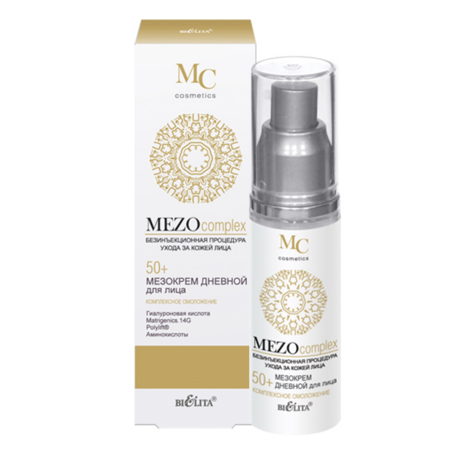 Дневной мезокрем оказывает комплексное действие на кожу лица: эффективно разглаживает морщины в области "треугольника красоты", обеспечивает эффект лифтинга, глубоко увлажняет, усиливает синтез коллагена, эластина и гиалуроновой кислоты, улучшает цвет лица. Matrigenics.14G активирует 14 генов, участвующих в синтезе коллагена, эластина и гиалуроновой кислоты, восстанавливает "треугольник красоты", разглаживает морщины на лбу, носогубные складки, морщины вокруг губ. PolyLift® обеспечивает эффект лифтинга, придает коже упругость, выравнивает микрорельеф, сокращает морщины. Гиалуроновая кислота направленного действия проникает в глубокие слои эпидермиса, обеспечивает видимый эффект разглаживания морщин путем выталкивания их изнутри, оказывая действие подобное салонной процедуре мезотерапии. Коктейль из аминокислот (таурин, глицин, аргинин) наполняет клетки кожи энергией и жизненной силой, способствует клеточной регенерации. Внимание: активная формула — возможно пощипывание.