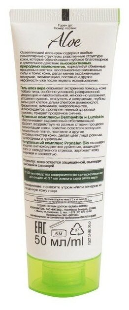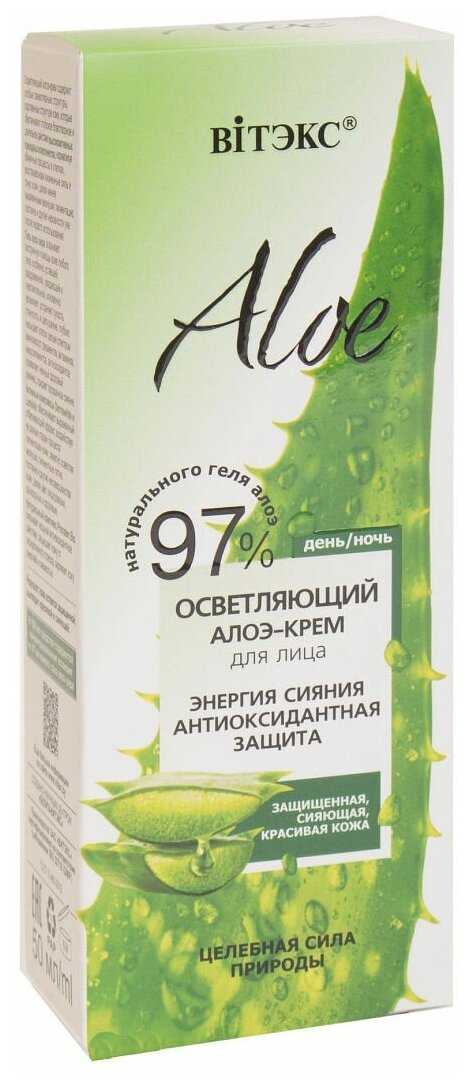 Осветляющий алоэ-крем содержит особые ламеллярные структуры, родственные структуре кожи, которые обеспечивают глубокое благотворное и длительное действие высокоактивных природных компонентов, нормализуя обменные процессы в клетках, восстанавливая жизненные силы и тонус кожи, делая менее выраженными веснушки, пигментацию, постакне и другие неровности уже после первого использования. Гель алоэ вера оказывает экстренную помощь коже любого типа, особенно уставшей, раздраженной, увядающей и чувствительной, мгновенно увлажняет, устраняет сухость, стянутость и шелушение, глубоко насыщает клетки целым спектром аминокислот, ферментов, витаминов, микроэлементов, антиоксидантов, проявляет нежный здоровый румянец, придает прозрачное сияние.