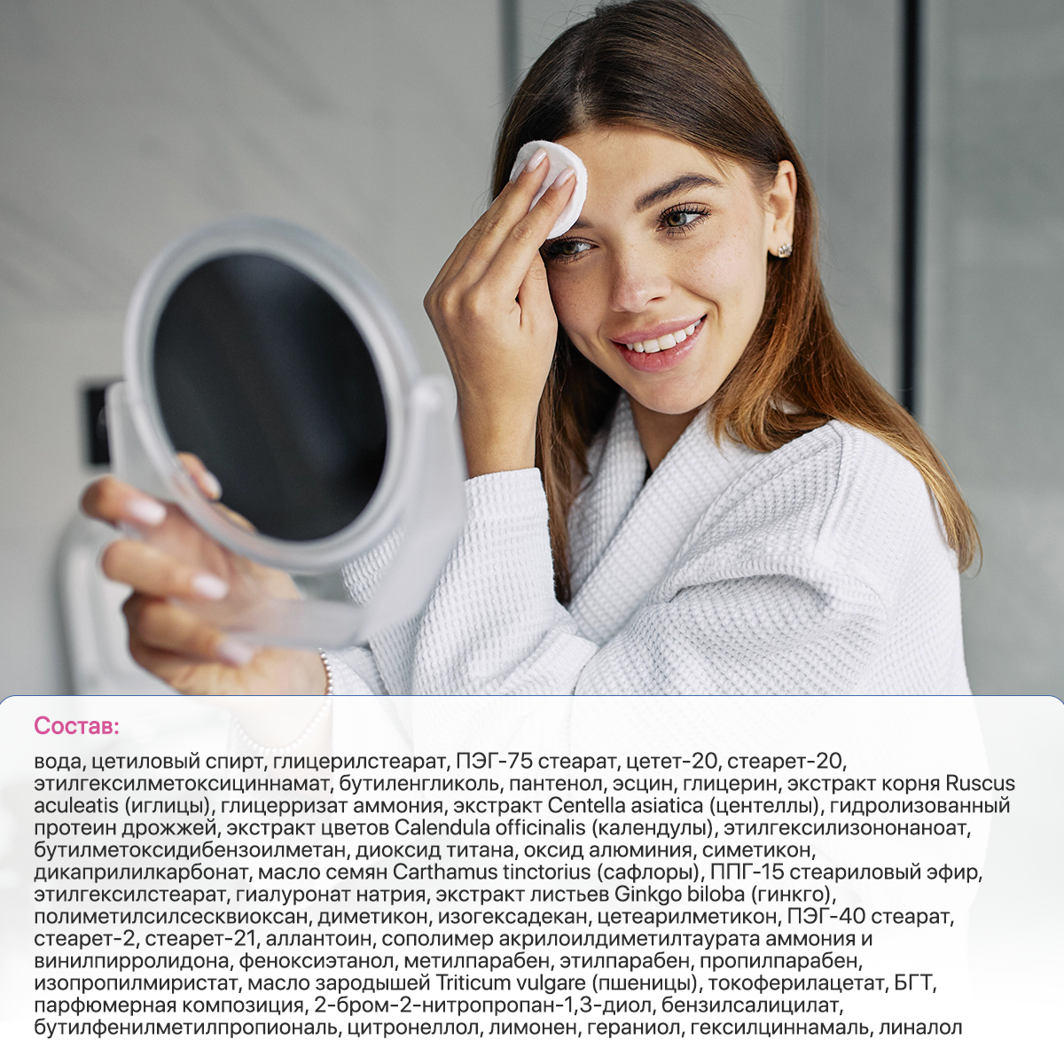 | Состав | вода, цетиловый спирт, глицерилстеарат, пэг-75 стеарат, цетет-20, стеарет-20, этилгексилметоксициннамат, бутиленгликоль, пантенол, эсцин, глицерин, экстракт корня ruscus aculeatis (иглицы), глицерризат аммония, экстракт centella asiatica (центеллы), гидролизованный протеин дрожжей, экстракт цветов calendula officinalis (календулы), этилгексилизононаноат, бутилметоксидибензоилметан, диоксид титана, оксид алюминия, симетикон, дикаприлилкарбонат, масло семян carthamus tinctorius (сафлоры), ппг-15 стеариловый эфир, этилгексилстеарат, гиалуронат натрия, экстракт листьев ginkgo biloba (гинкго), полиметилсилсесквиоксан, диметикон, изогексадекан, цетеарилметикон, пэг-40 стеарат, стеарет-2, стеарет-21, аллантоин, сополимер акрилоилдиметилтаурата аммония и винилпирролидона, феноксиэтанол, метилпарабен, этилпарабен, пропилпарабен, изопропилмиристат, масло зародышей triticum vulgare (пшеницы), токоферилацетат, бгт, парфюмерная композиция, 2-бром-2-нитропропан-1,3-диол, бензилсалицилат, бутилфенилметилпропиональ, цитронеллол, лимонен, гераниол, гексилциннамаль, линалол |