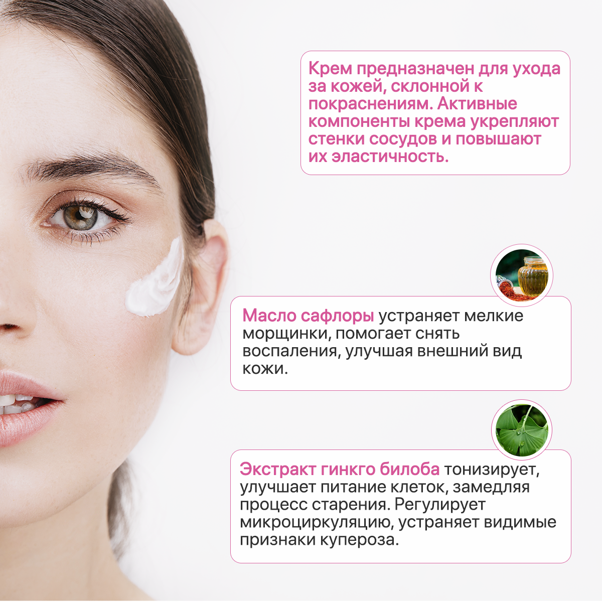 Крем предназначен для ухода за кожей, склонной к покраснениям и куперозу. Активные компоненты крема укрепляют стенки сосудов и повышают их эластичность. Оказывая успокаивающее, смягчающее действие, предотвращают появление "сосудистых звездочек". Масло сафлоры (Carthamus tinctorius) устраняет мелкие морщинки, помогает снять воспаления, улучшая внешний вид кожи. Экстракт гинкго билоба (Ginkgo biloba) тонизирует, улучшает питание клеток, замедляя процесс старения. Высокоэффективный компонент Biophytex регулирует микроциркуляцию, устраняет видимые признаки купероза. В состав крема входит УФ-фильтр, который нейтрализует негативное воздействие ультрафиолета, защищая ослабленную, склонную к покраснениям кожу.