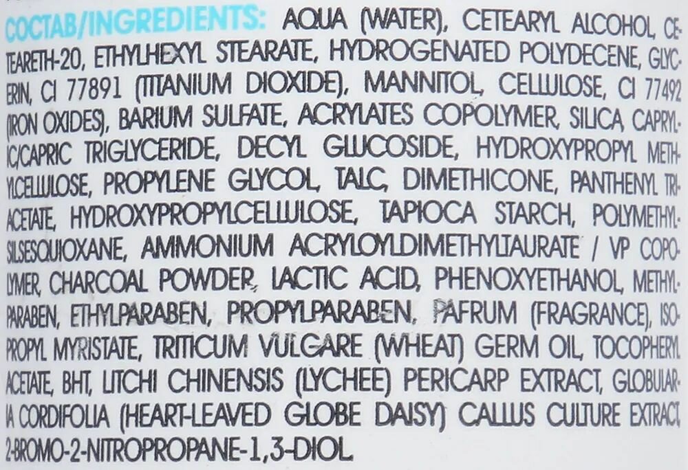 | Состав | вода, цетеариловый спирт, цетеарет-20, глицерин, этилгексилстеарат, гидрогенизированный полидецен, CI 77891 (диоксид титана), маннитол, целлюлоза, CI 77492 (оксиды железа), сульфат бария, сополимер акрилатов, диоксид кремния, глицерилтрикаприлат/капрат, децилглюкозид, гидроксипропилметилцеллюлоза, цетеариловый спирт, глицерилтрикаприлат/капрат, пропиленгликоль, диметикон, тальк, целлюлоза, пантенилтриацетат, гидроксипропилцеллюлоза, молочная кислота, сополимер винилпирролидона и акрилоилдиметилтаурата аммония, порошок угля, диоксид кремния, крахмал тапиоки, полиметилсилсесквиоксан, феноксиэтанол, метилпарабен, этилпарабен, пропилпарабен, парфюмерная композиция, экстракт Litchi Chinensis (личи), изопропилмиристат, масло зародышей Triticum vulgare (пшеницы), токоферилацетат, БГТ, гидроксид натрия, экстракт околоцветника Globularia cordifolia (сердцелистой маргаритки), 2-бром-2-нитропропан-1,3-диол |