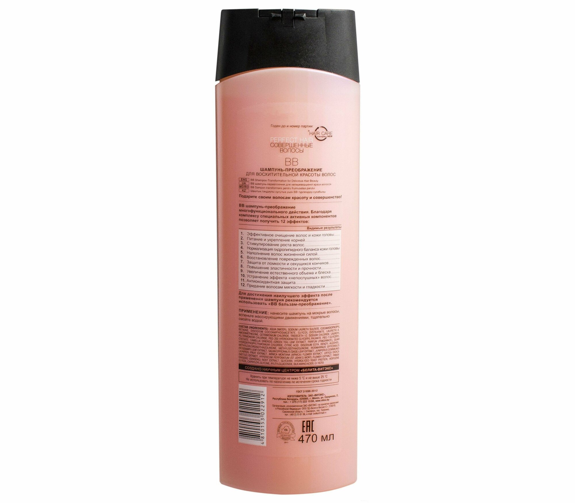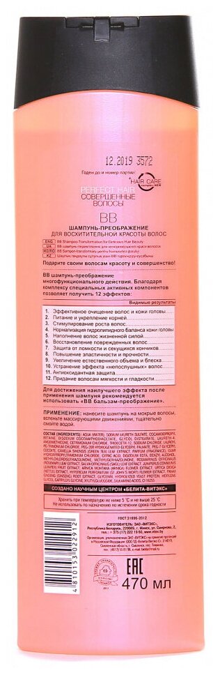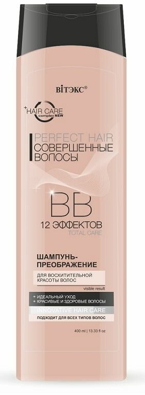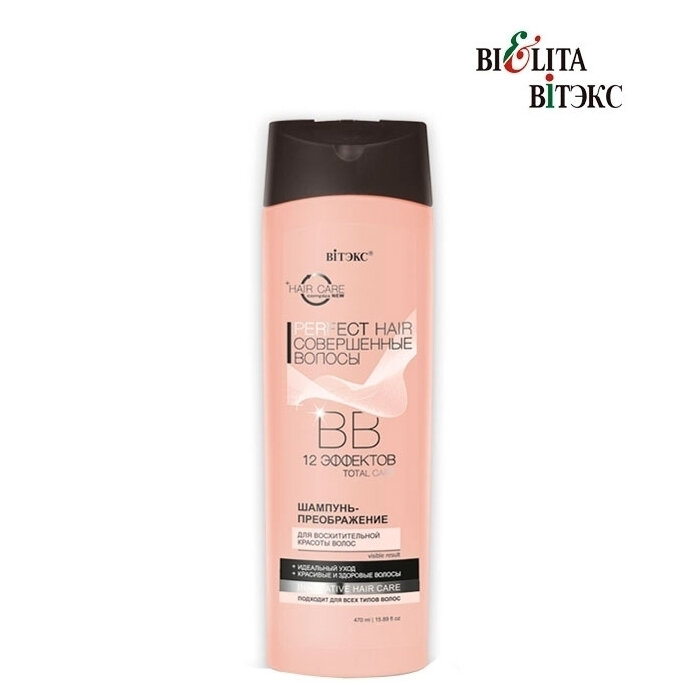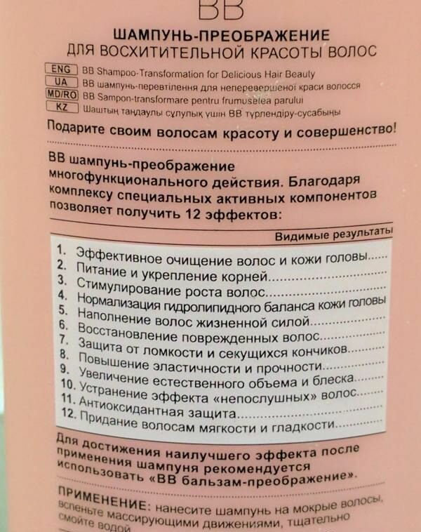 BB шампунь-преображение подходит для всех типов волос и подготавливает волосы к последующему уходу. Комплекс специальных активных компонентов позволяет получить 12 эффектов; эффективное очищение волос и кожи головы, питание и укрепление корней, стимулирование роста волос, нормализация гидролипидного баланса кожи головы, наполнение волос жизненной силой, восстановление поврежденных волос, защита от ломкости и секущихся кончиков, повышение эластичности и прочности, увеличение естественного объема и блеска, устранение эффекта «непослушных» волос, антиоксидантная защита, придание волосам мягкости и гладкости.