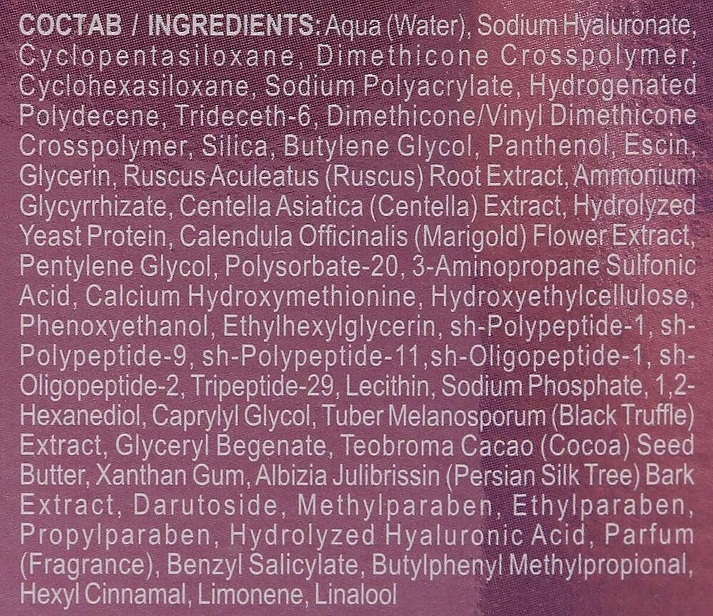 | Состав | вода; гиалуронат натрия; циклопентасилоксан; кроссполимер диметикона; циклопентасилоксан; циклогексасилоксан; полиакрилат натрия; гидрогенизированный полидецен; тридецет-6; кроссполимер диметикона/винилдиметикона; диоксид кремния; бутиленгликоль; пантенол; эсцин; глицерин; экстракт корня Ruscus Aculeatus (иглицы); глицерризат аммония; экстракт Centella Asiatica (центеллы); гидролизованный протеин дрожжей; экстракт цветов Calendula Officinalis (календулы); пентиленгликоль; полисорбат-20; 3-аминопропансульфоновая кислота; гидроксиметионин кальция; гидроксиэтилцеллюлоза; феноксиэтанол; этилгексилглицерин; sh-полипептид-1; sh-полипептид-9; sh-полипептид-11; sh-олигопептид-1; sh-олигопептид-2; трипептид-29; лецитин; фосфат натрия; 1; 2-гександиол; каприлилгликоль; экстракт Tuber Melanosporum (черного трюфеля); глицерилбегенат; масло семян Teobroma Cacao (какао); ксантановая камедь; экстракт коры Albizia Julibrissin (акации шелковой); дарутозид; метилпарабен; этилпарабен; пропилпарабен; гидролизованная гиалуроновая кислота; парфюмерная композиция; бензилсалицилат; бутилфенилметилпропиональ; гексилциннамаль; лимонен; линалол; бензилсалицилат; бутилфенилметилпропиональ; гексилциннамаль; лимонен; линалол) |