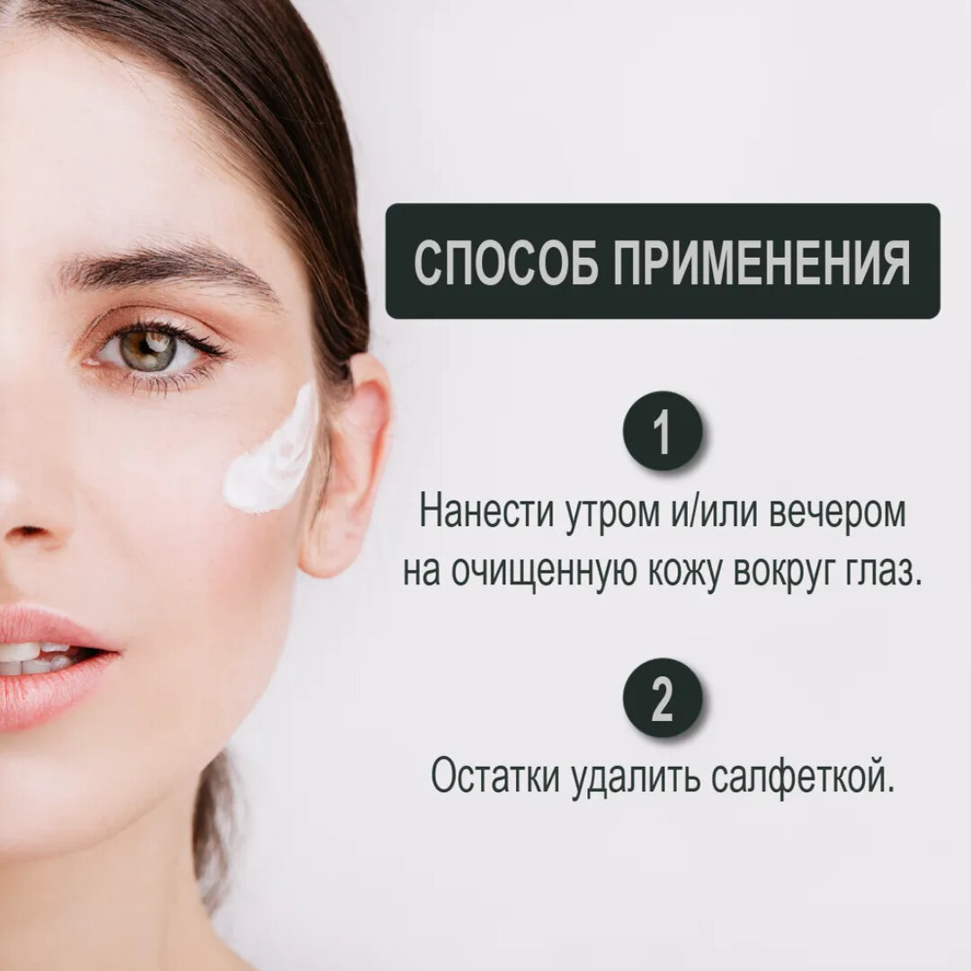 Комплекс активных компонентов обеспечивает: уменьшение выраженности морщин, длительное антивозрастное действие на кожу вокруг глаз, уменьшение припухлостей и темных кругов под глазами, насыщение клеток кожи влагой.
