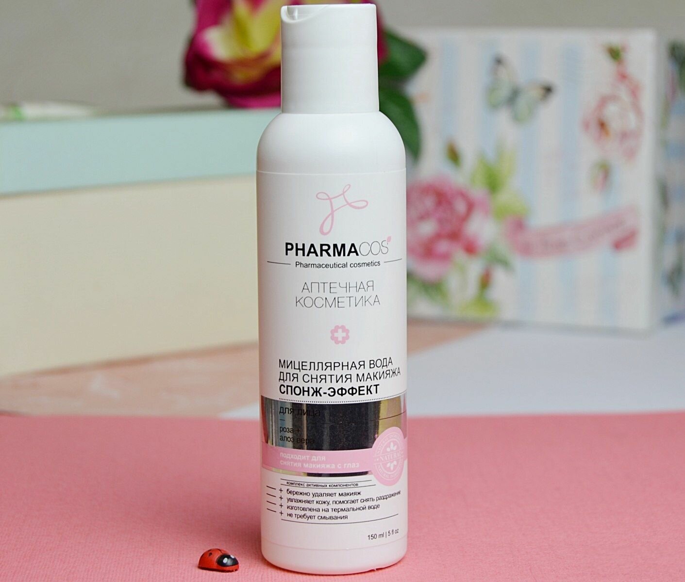 Мицеллярная вода эффективно очищает кожу, мягко и деликатно снимает макияж с лица и век, не вызывая раздражения. Увлажняет, дарит ощущение чистоты и придает коже свежесть. Флорапон розы (Rosa Damascena) очищает и омолаживает кожу, придает ей свежесть, упругость и эластичность, выравнивая цвет лица. Алоэ вера (Aloe vera) увлажняет кожу, обогащает ее необходимыми питательными веществами. Экстракт ромашки (Chamomilla Recutita) усиливает регенеративные процессы в клетках кожи, снимает раздражения, устраняет шелушение, придает коже здоровый цвет. Термальная вода содержит большое количество минералов и микроэлементов, успокаивает, восстанавливает кожу, повышает ее защитные свойства. Благодаря использованию мицеллярной воды для снятия макияжа с розой и алоэ вера кожа становится более нежной и бархатистой.
