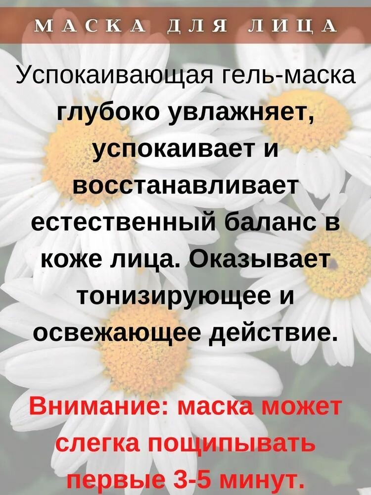 Успокаивающая гель-маска глубоко увлажняет, успокаивает и восстанавливает естественный баланс в коже лица. Оказывает тонизирующее и освежающее действие. Внимание: маска может слегка пощипывать первые 3-5 минут. Подходит для всех типов кожи.