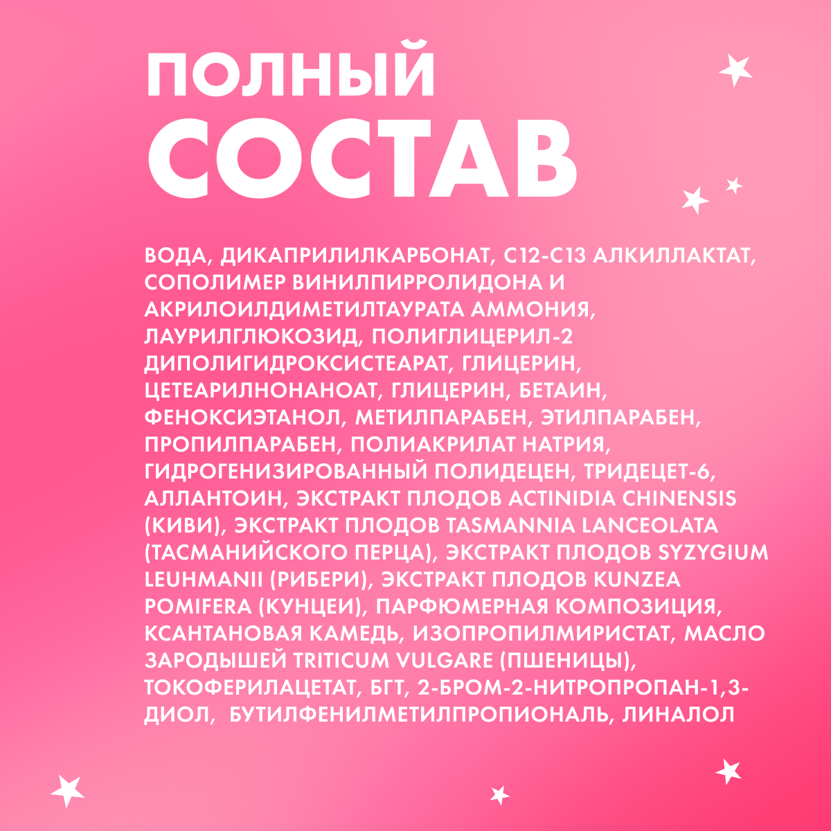 | Состав | вода, дикаприлилкарбонат, С12-С13 алкиллактат, сополимер винилпирролидона и акрилоилдиметилтаурата аммония, лаурилглюкозид, полиглицерил-2 диполигидроксистеарат, глицерин, цетеарилнонаноат, глицерин, бетаин, феноксиэтанол, метилпарабен, этилпарабен, пропилпарабен, полиакрилат натрия, гидрогенизированный полидецен, тридецет-6, аллантоин, экстракт плодов Actinidia Chinensis (киви), экстракт плодов Tasmannia Lanceolata (тасманийского перца), экстракт плодов Syzygium Leuhmanii (рибери), экстракт плодов Kunzea Pomifera (кунцеи), парфюмерная композиция, ксантановая камедь, изопропилмиристат, масло зародышей Triticum vulgare (пшеницы), токоферилацетат, БГТ, 2-бром-2-нитропропан-1,3-диол, бутилфенилметилпропиональ, линалол |