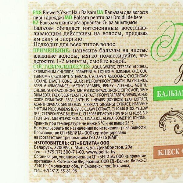 Бальзам для волос Пивные дрожжи Белита 450 мл Белита СП ООО (578415)