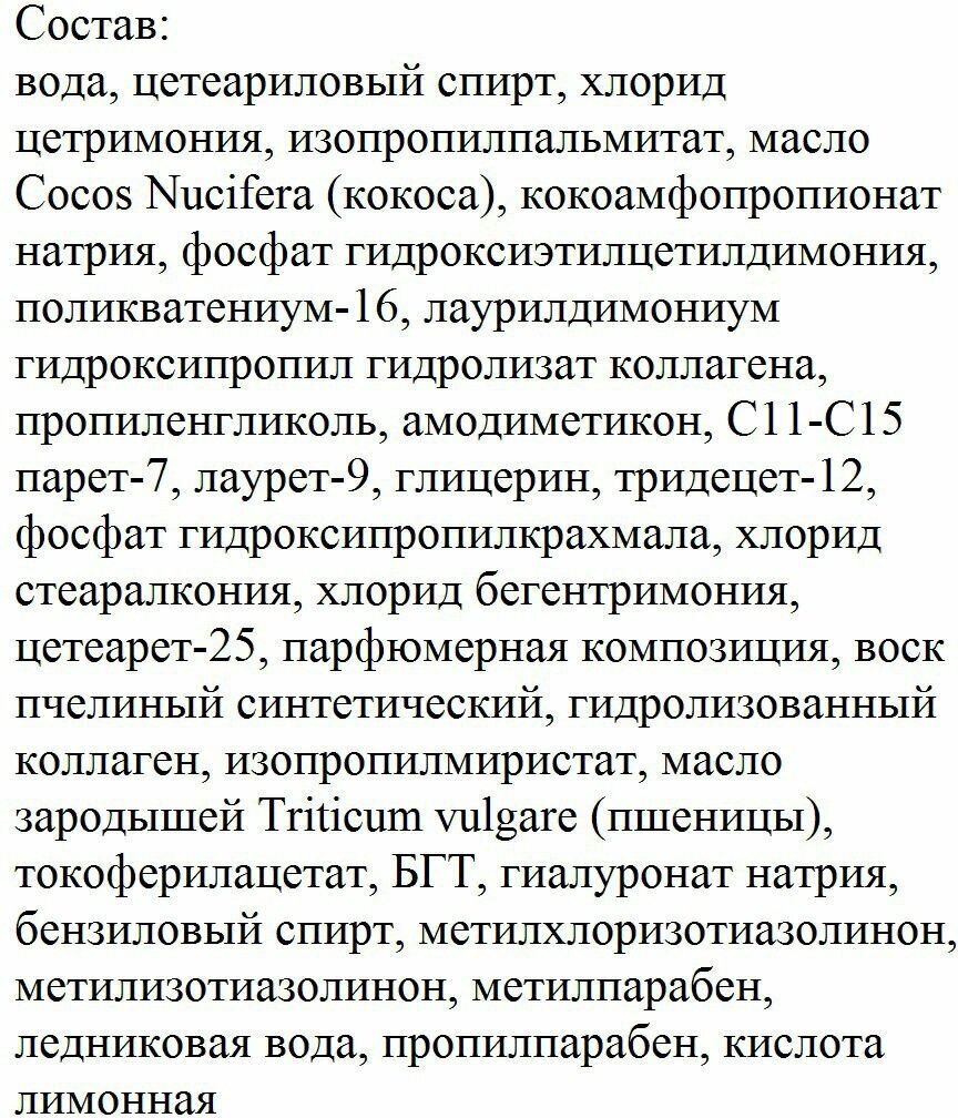 | Состав | вода; цетеариловый спирт; хлорид цетримония; изопропилпальмитат; масло cocos nucifera (кокоса); кокоамфопропионат натрия; фосфат гидроксиэтилцетилдимония; поликватениум-16; лаурилдимониум гидроксипропил гидролизат коллагена; пропиленгликоль; амодиметикон; c11-c15 парет-7; лаурет-9; глицерин; тридецет-12; фосфат гидроксипропилкрахмала; хлорид стеаралкония; хлорид бегентримония; цетеарет-25; парфюмерная композиция; воск пчелиный синтетический; гидролизованный коллаген; изопропилмиристат; масло зародышей triticum vulgare (пшеницы); токоферилацетат; бгт; гиалуронат натрия; бензиловый спирт; метилхлоризотиазолинон; метилизотиазолинон; метилпарабен; ледниковая вода; пропилпарабен; кислота лимонная |