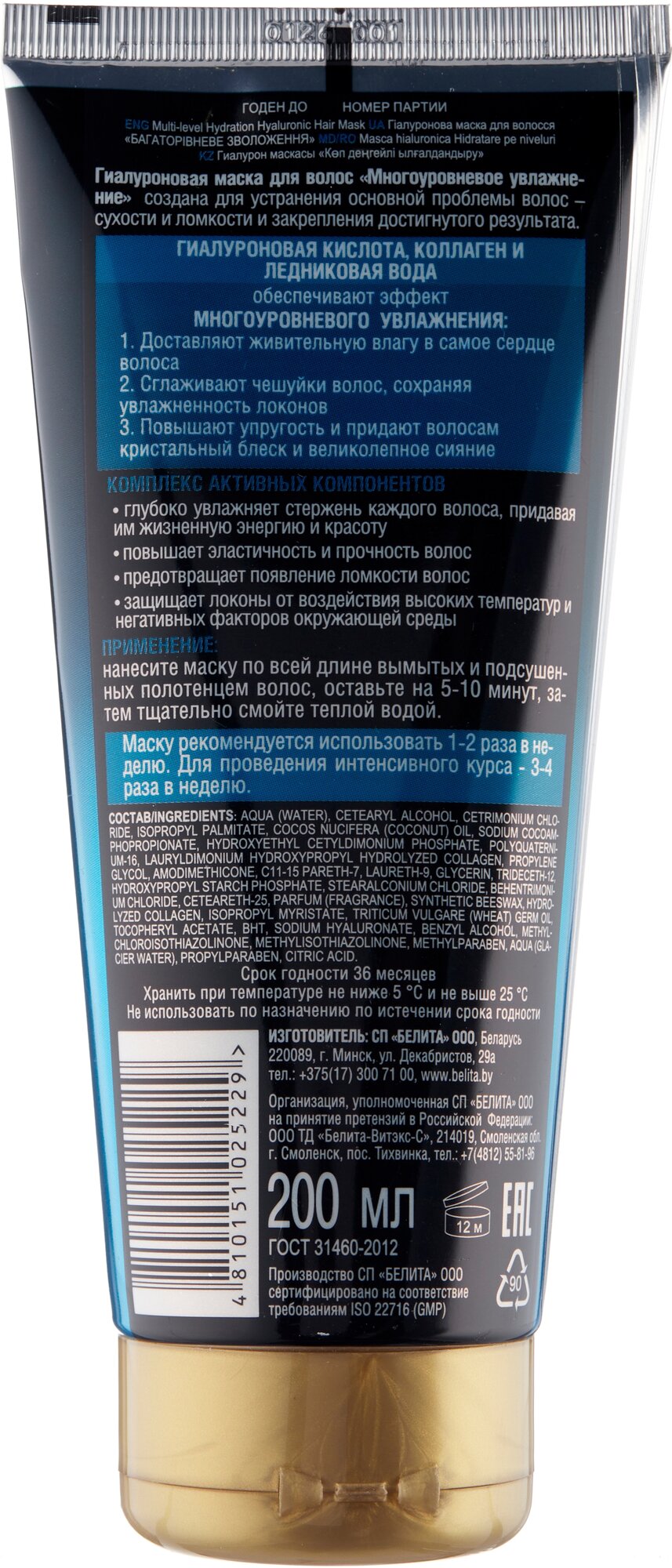Маска для волос гиалуроновая Многоуровневое увлажнение Белита 200 мл Белита СП ООО (578415)