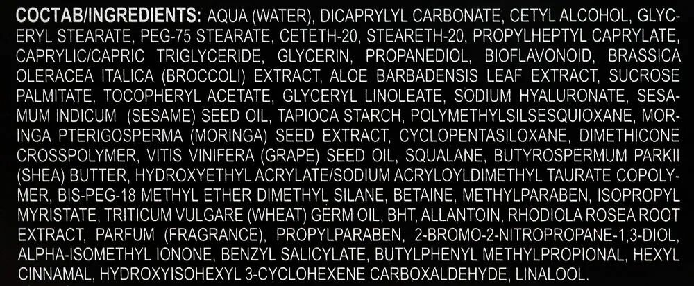| Состав | вода, дикаприлилкарбонат, цетиловый спирт, глицерилстеарат, пэг-75 стеарат, цетет-20, стеарет-20, пропилгептилкаприлат, глицерилтрикаприлат/капрат, глицерин, пропандиол, биофлавоноид, экстракт brassica oleracea italica (брокколи), экстракт листьев aloe barbadensis (алоэ), масло sesamum indicum (кунжута), глицерилстеарат, крахмал тапиоки, полиметилсилсесквиоксан, экстракт семян moringa pterigosperma (моринги), циклопентасилоксан, кроссполимер диметикона, масло косточек vitis vinifera (винограда), сквалан, масло косточек butyrospermum parkii (ши), сополимер гидроксиэтилакрилата / акрилоилдиметилтаурата натрия, бис-пэг-18 метиловый эфир диметилсилана, бетаин, пальмитат сахарозы, токоферидацетат, глицериллинолеат, гиалуронат натрия, метилпарабен, изопропилмиристат, масло зародышей triticum vulgare (пшеницы), токоферилацетат, бгт, экстракт корня rhodiola rosea (родиолы розовой), аллантоин, парфюмерная композиция, пропилпарабен, 2-бром-2-нитропропан-1,3-диол, альфа-изометилионон, бензилсалицилат, бутилфенилметилпропиональ, гексилциннамаль, гидроксиизогексил-3-циклогексенкарбоксальдегид, линалол |