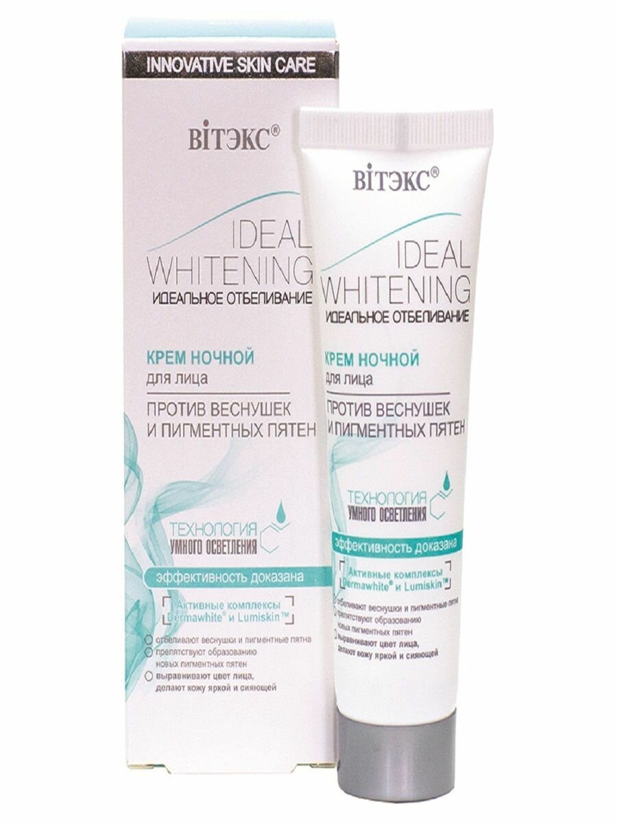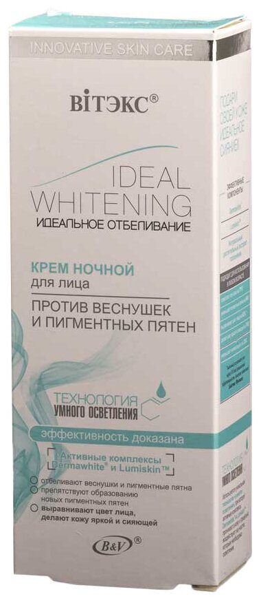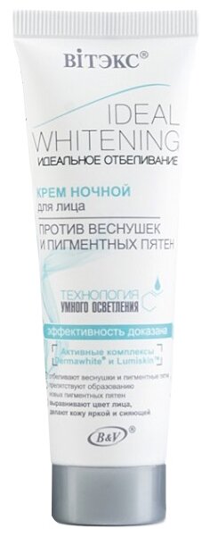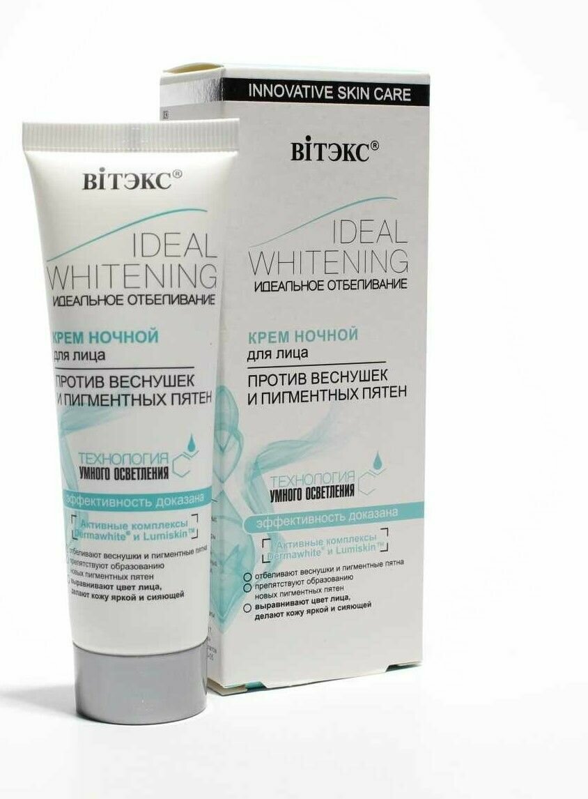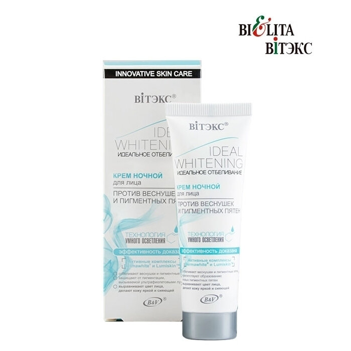 Теперь для осветления темных пигментных пятен и веснушек достаточно просто нанести ночной отбеливающий крем перед сном. Ночной крем обеспечивает активное отбеливание веснушек и пигментных пятен на коже во время сна, когда кожа находится в состоянии покоя и наиболее восприимчива к действию активных веществ. Пока Вы спите, уникальная технология "умного" осветления кожи комплексов DermaWhite и Lumiskin активно работает: происходит определение пигментированных участков, которым необходимо осветление и прицельное воздействие на них. Крем помогает снизить синтез меланина, минимизировать появление пигментных пятен и обеспечивает отбеливание кожи. Натуральный растительный экстракт толокнянки усиливает отбеливающий эффект и увлажняет кожу.