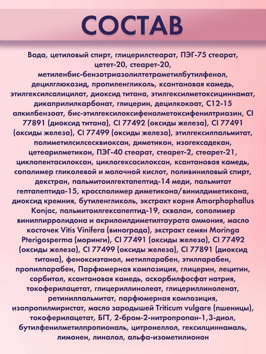 Комплекс активных компонентов: уменьшает видимость морщин и пор, тонирует и выравнивает цвет лица, увлажняет, в течение дня защищает от УФ-излучения. Сочетает в себе антивозрастное ухаживающее действие дневного крема и безупречное тональное покрытие с УФ-защитой.