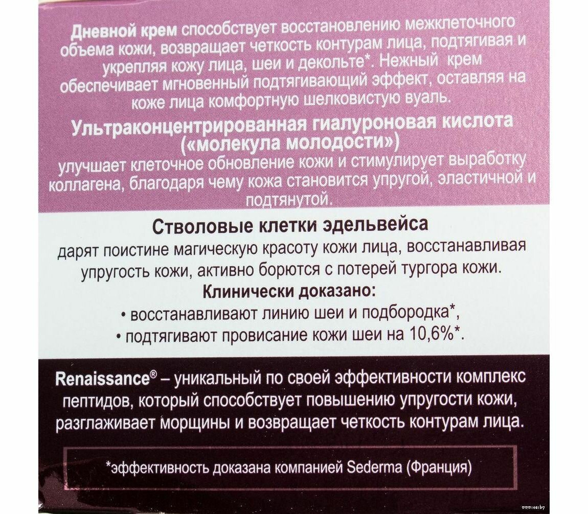 Дневной крем способствует восстановлению межклеточного объема кожи, возвращает четкость контурам лица, подтягивая и укрепляя кожу лица, шеи и декольте. Нежный крем обеспечивает мгновенный подтягивающий эффект, оставляя на коже лица комфортную шелковистую вуаль. Активные компоненты: ультраконцентрированная гиалуроновая кислота, стволовые клетки эдельвейса, peptide-комплекс Renaissance.