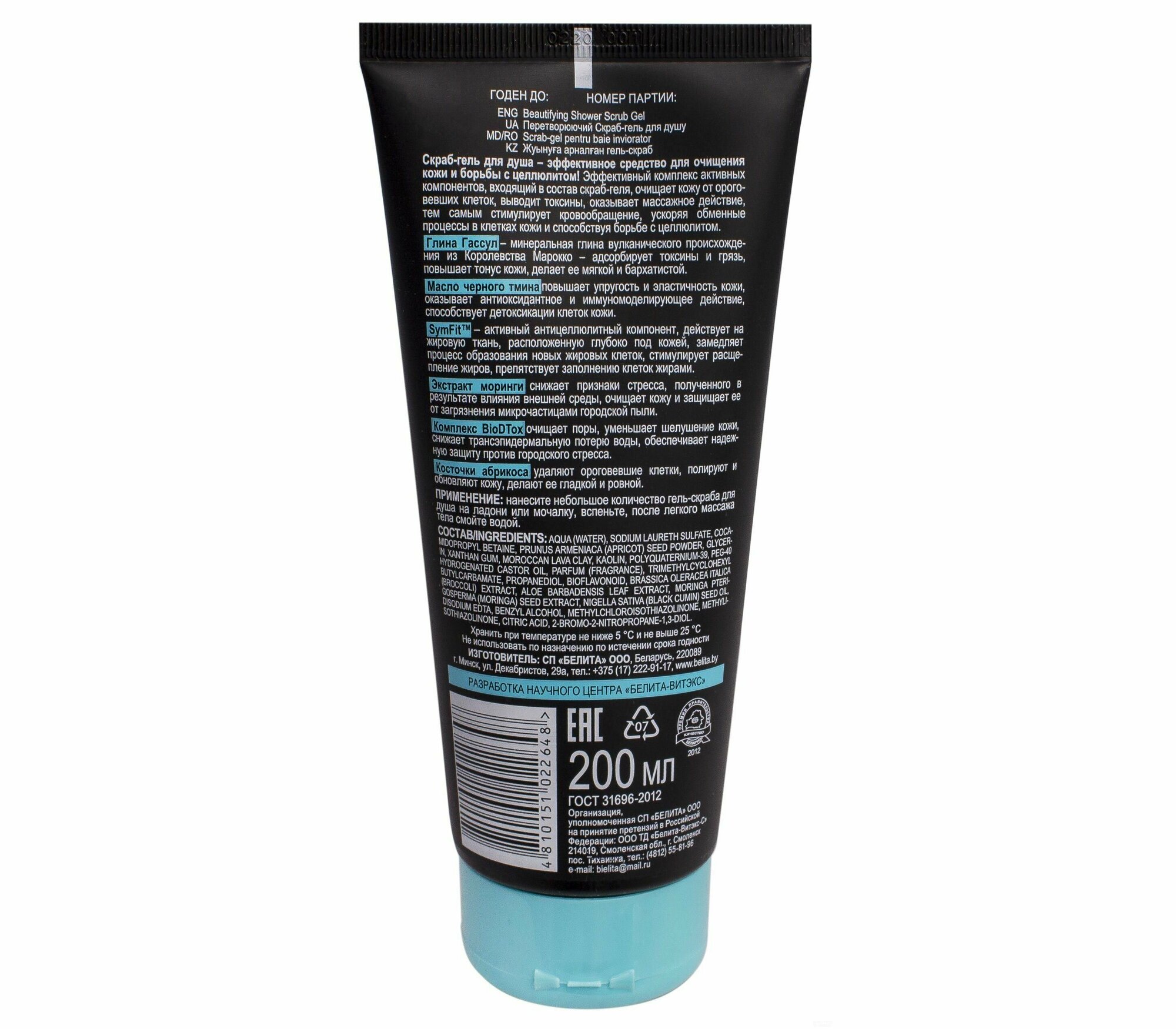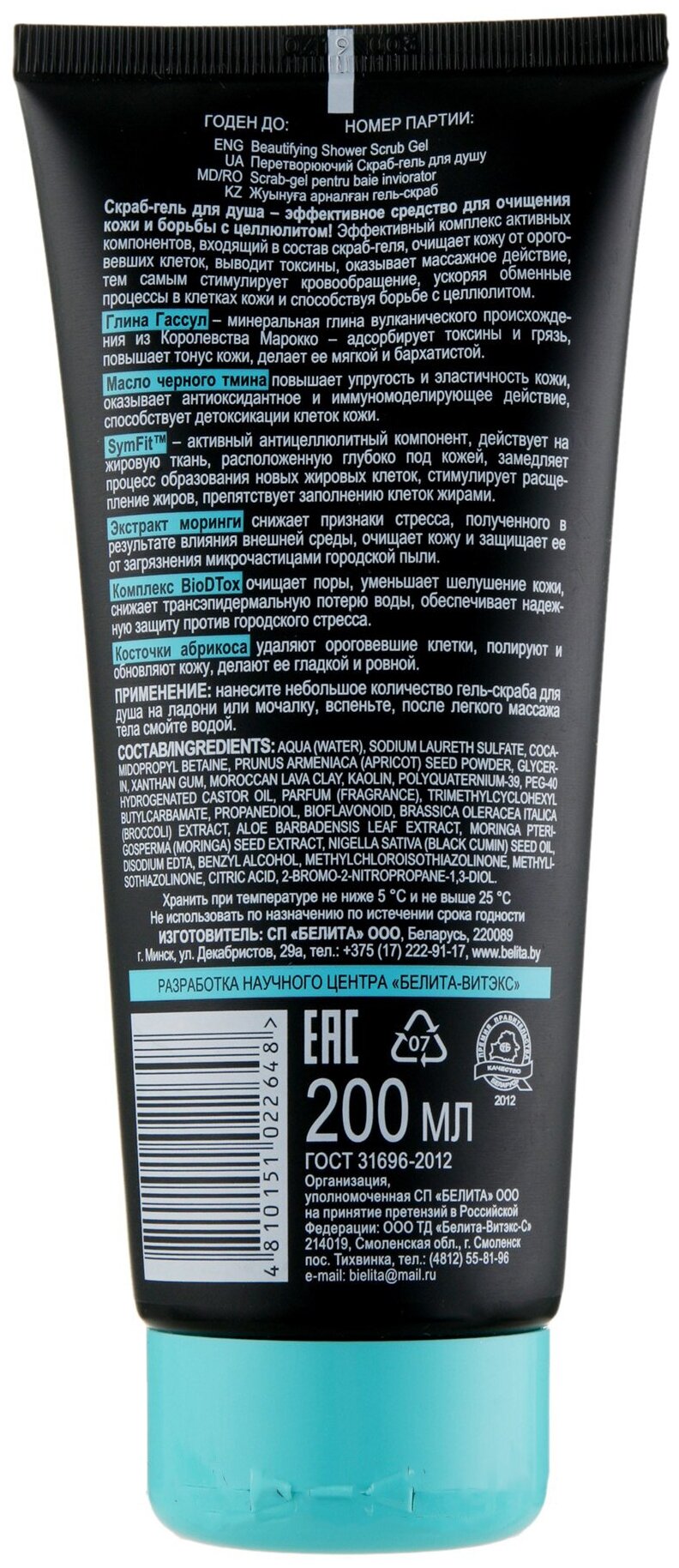 Скраб-гель очищает кожу от ороговевших клеток, выводит токсины, оказывает массажное действие, тем самым стимулирует кровообращение, ускоряя обменные процессы в клетках кожи и способствуя борьбе с целлюлитом. Глина Гассул адсорбирует токсины и грязь, повышает тонус кожи, делает ее мягкой и бархатистой. Масло черного тмина повышает упругость и эластичность кожи, способствует детоксикации клеток кожи. SymFit замедляет процесс образования новых жировых клеток, стимулирует расщепление жиров, препятствует заполнению клеток жирами. Экстракт моринги очищает кожу и защищает ее от загрязнения микрочастицами городской пыли. Косточки абрикоса удаляют ороговевшие клетки, полируют и обновляют кожу, делают ее гладкой и ровной.