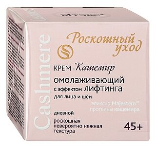 Богатая композиция компонентов крема-кашемира разработана специально для зрелой кожи лица и шеи. Невероятно нежная роскошная текстура в течение дня окутывает чарующей мягкостью кашемира, при этом совершенствует и омолаживает кожу не только на поверхности, но и в глубоких слоях, чтобы устранить существующие признаки старения и предотвратить появление новых. Протеины кашемира обеспечивают увлажнение, питание и защиту кожи, способствуют формированию восхитительно свежего и равномерного цвета лица. Эликсир Majestemтм обладает исключительной омолаживающей силой, уменьшая и "замораживая" морщины в области губ, лба и переносицы, укрепляя овал лица. Активизируется выработка собственного коллагена, улучшаются обменные процессы в эпидермисе, кожа разглаживается и подсвечивается, становится нежной и бархатистой. Сразу после нанесения образуется невесомый поддерживающий каркас, который мгновенно преображает кожу: "стирает" морщинки, очерчивает контуры лица, выравнивает кожу.