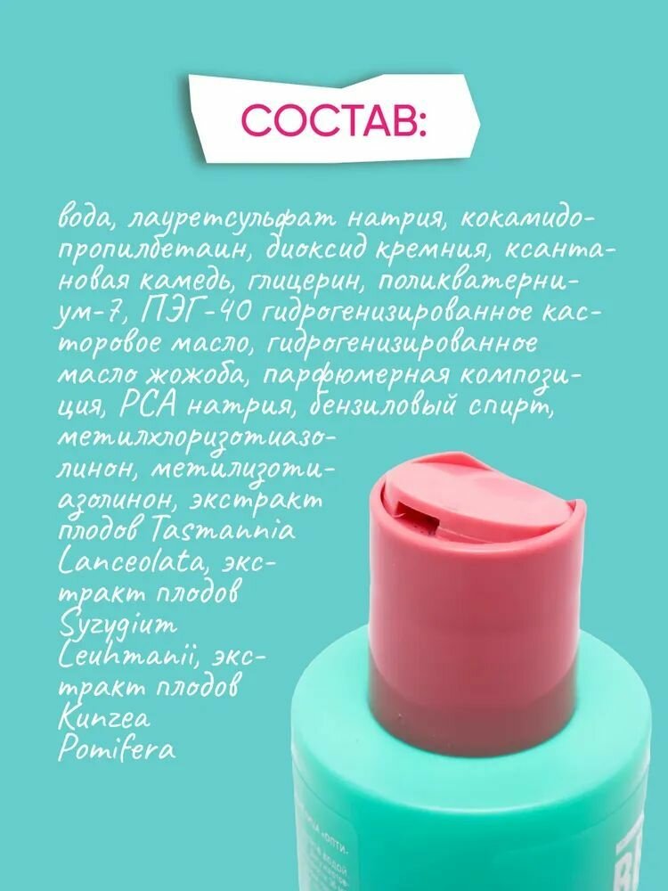 | Состав | Вода, лауретсульфат натрия, кокамидопропилбетаин, диоксид кремния, ксантановая камедь, глицерин, поликватерниум-7, ПЭГ-40 гидрогенизированное касторовое масло, гидрогенизированное масло жожоба, парфюмерная композиция, PCA натрия, бензиловый спирт, метилхлоризотиазолинон, метилизотиазолинон, экстракт плодов tasmannia lanceolata, экстракт плодов syzygium leuhmanii, экстракт плодов kunzea pomifera |
