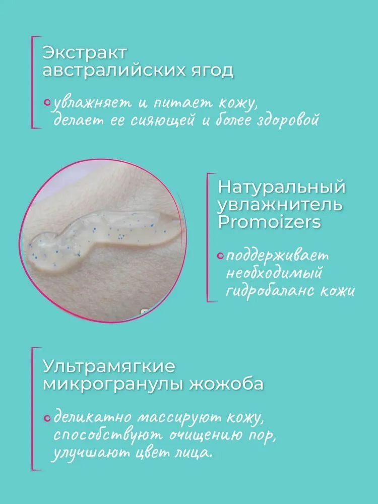 Австралийские ягоды, Promoizers, гранулы жожоба, витамин Е. Деликатное очищение и уход. Выравнивание рельефа кожи. Подходит для ежедневного применения. Не сушит кожу. Гель тщательно очищает кожу от загрязнений, не оставляя чувства стянутости. Ультрамягкие микрогранулы жожоба деликатно массируют кожу, способствуют очищению пор, улучшают цвет лица. Натуральный увлажнитель Promoizers поддерживает необходимый гидробаланс кожи. Экстракт австралийских ягод увлажняет и питает кожу, делает ее сияющей и более здоровой. Подходит для ежедневного применения.