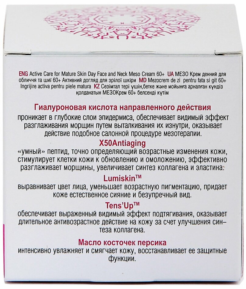 Насыщенный дневной мезокрем специально разработан для ухода за зрелой кожей лица в возрасте старше 60 лет. Специально подобранные высокоэффективные компоненты, которые оказывают комплексное действие на кожу лица: смягчают и сокращают морщины глубоко питают и увлажняют снижают возрастную пигментацию восстанавливают природную способность кожи к выработке коллагена и эластина возвращают упругость и эластичность кожи интенсивно подтягивают и борются с провисанием кожи восстанавливают четкий контур лица Гиалуроновая кислота направленного действия проникает в глубокие слои эпидермиса, обеспечивает видимый эффект разглаживания морщин путем выталкивания их изнутри, оказывает действие подобное салонной процедуре мезотерапии. X50Antiaging стимулирует клетки кожи к обновлению и омоложению, эффективно разглаживает морщины, увеличивает синтез коллагена и эластина. Lumiskin выравнивает цвет лица, уменьшает возрастную пигментацию, придает коже естественное сияние и безупречный вид. Tens'Up обеспечивает выраженный видимый эф