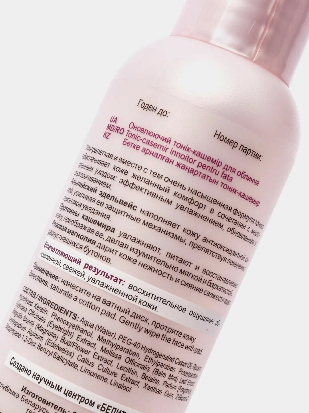 Ультралегкая и вместе с тем очень насыщенная формула тоника обеспечивает коже желанный комфорт в сочетании с многогранным уходом: эффективным увлажнением, обновлением и разглаживанием. Альпийский эдельвейс наполняет кожу антиоксидантной силой, усиливая ее защитные механизмы, препятствуя появлению признаков увядания. Протеины кашемира увлажняют, питают и восстанавливают кожу, преображая ее, делая изумительно мягкой и бархатистой. Розовая магнолия дарит коже нежность и сияние свежести едва распустившихся бутонов.