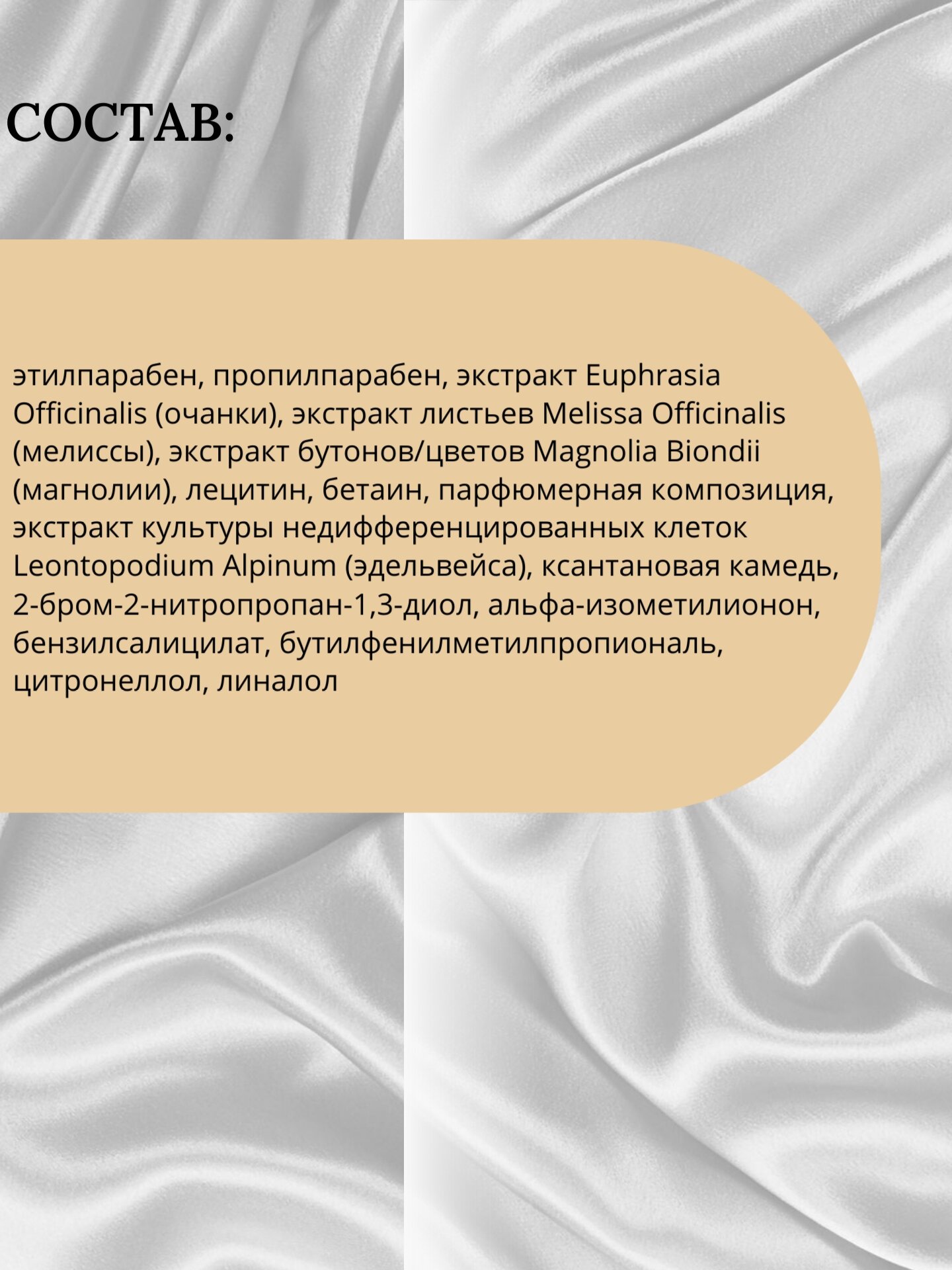 | Состав | этилпарабен, пропилпарабен, экстракт Euphrasia Officinalis (очанки), экстракт листьев Melissa Officinalis (мелиссы), экстракт бутонов/цветов Magnolia Biondii (магнолии), лецитин, бетаин, парфюмерная композиция, экстракт культуры недифференцированных клеток Leontopodium Alpinum (эдельвейса), ксантановая камедь, 2-бром-2-нитропропан-1,3-диол, альфа-изометилионон, бензилсалицилат, бутилфенилметилпропиональ, цитронеллол, линалол |