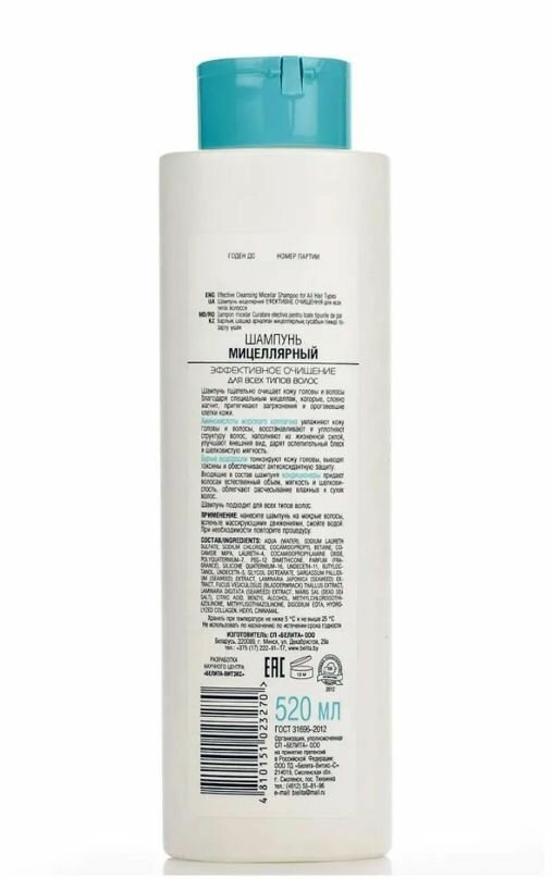 Шампунь для волос мицеллярный Эффективное очищение Морской коллаген Белита 520 мл Белита СП ООО (578415)