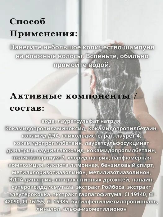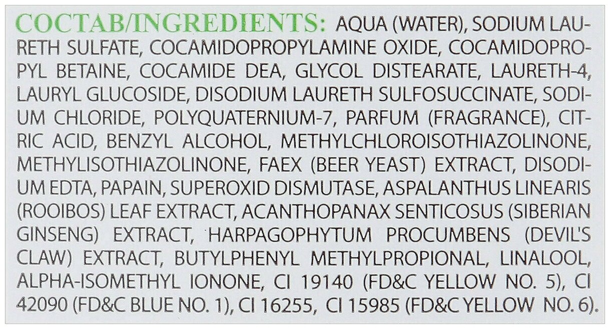 | Состав | вода; лауретсульфат натрия; кокамидопропиламиноксид; кокамидопропилбетаин; кокамид дэа; гликольдистеарат; лаурет-4; кокамидопропилбетаин; лауретсульфосукцинат динатрия; лаурилглюкозид; кокамидопропилбетаин; поликватерниум-7; хлорид натрия; парфюмерная композиция; кислота лимонная; бензиловый спирт; метилхлоризотиазолинон; метилизотиазолинон; эдта динатрия; экстракт пивных дрожжей; папаин; супероксиддисмутаза; экстракт ройбоса; экстракт элеутерококка; экстракт гарпагофитума; ci 19140; ci 42090; ci 16255; ci 15985; бутилфенилметилпропиональ; линалол; альфа-изометилионон |