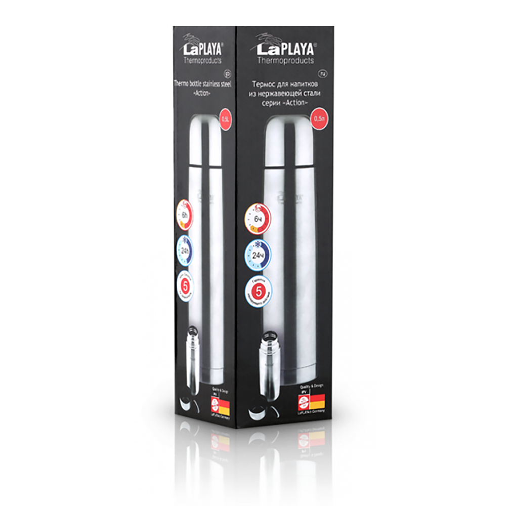 Термосы серии ACTION, как и все другие изделия немецкой торговой марки LaPLAYA, изготовлены из нержавеющей стали высокого качества марки 18/8 как внутри, так и снаружи.