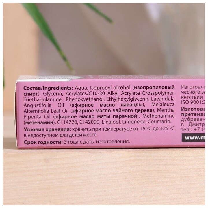 | Состав | аqua; isopropyl alcohol; acrylates/c10-30 alkyl acrylate crosspolymer; triethanolamine; phenoxyethanol; ethylhexylglycerin; lavandula angustifolia oil; melaleuca alternifolia leaf oil; mentha piperita oil; methenamine; ci 14720; ci 42090; linalool; limonene; coumarin |