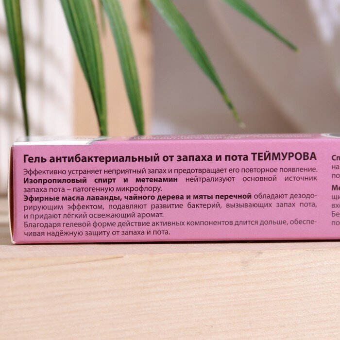 В комплекте 1 шт.Гель антибактериальный от запаха и пота Теймурова - это удобное средство для ежедневной борьбы с неприятным запахом и дискомфортом от повышенного потоотделения. Эффект проявляется сразу после нанесения геля. Активные ингредиенты средства:- метенамин и изопропиловый спирт обладают противомикробным и бактерицидным эффектом, безопасны для кожи;- масло чайного дерева и масло лаванды обеспечивают мягкое обеззараживание и сохраняют ощущение чистоты без неприятного запаха;- масло перечной мяты сохраняет ощущение свежести.Средство используется от пота и запаха ног и подмышек. Благодаря гелеобразной форме, эффект от применения сохраняется дольше. Рекомендуется наносить на чистые и сухие стопы, на чистые и сухие подмышки для пролонгированного действия. В составе не содержатся соли алюминия, которые используют производители химических антиперспирантов. Гель антибактериальный от запаха и пота отличается натуральным составом, безопасен для кожи и доступен по стоимости.Состав: aqua, isopropyl acohol, glycerin, acrylates/C10-30 alkyl acrylate crosspolymer, trierhanolamine, phenoxyethanol, ethylhexylglycerin, lavandula angustifolia oil (эфирное масло лаванды), melaleuca alternifolia leaf Oil (эфирное масло чайного дерева), mentha piperita oil (эфирное мясло мяты перечной), methenamine (метенамин), Cl 14720, Cl 42090, linalool, limonene, coumarin.