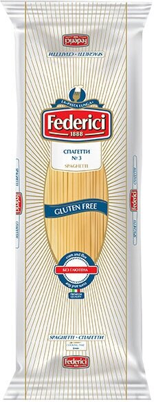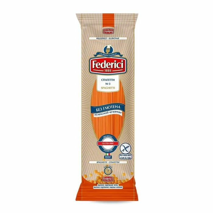 Spaghetti (Спагетти), пожалуй, самый любимый всеми вид пасты. Своё название она получила за схожесть с отрезками шпагата (итал. spago).Federici №3 Spaghetti (Спагетти) без глютена производятся из муки красной чечевицы, богатой такими влияющими на иммунитет микроэлементами как кальций, магний, калий, фосфор, железо, жирными кислотами Омега-3, Омега-6, фолиевой кислотой. Это прекрасный выбор питания для людей с непереносимостью глютена, также подойдет спортсменам и вегетарианцам, так как входящая в состав клетчатка, снижает чувство голода, и улучшает пищеварение.Spaghetti Federici gluten free во время приготовления прекрасно держат форму и не развариваются, имеют ореховый привкус и хорошо сочетаются с томатными мясными соусами, или сливочными и овощными с добавлением баклажанов, цукини и грибов.Качество продукции подтверждено сертификатами AOECS для безглютеновых продуктов питания и GFSO. Процесс производства безглютеновых макарон соответствует международному стандарту BRC по пищевой безопасности и проходит в отдельном корпусе, чтобы исключить вероятность попадания глютена.