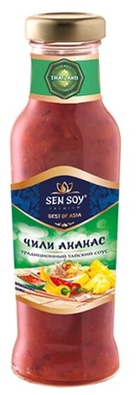 Кисло-сладкий ананас и острый жгучий чили составляют в Тайском соусе Чили Ананас Сэн Сой Премиум неповторимый букет вкуса, который прекрасно сочетается с самыми разнообразными продуктами начиная от лосося и заканчивая сладкими фруктами. Такой соус в Тайланде подают к блюдам из свинины и птицы, им заправляют мясные и фруктовые салаты, даже простой рис с тайским соусом Чили Ананас становится самой изысканной пищей