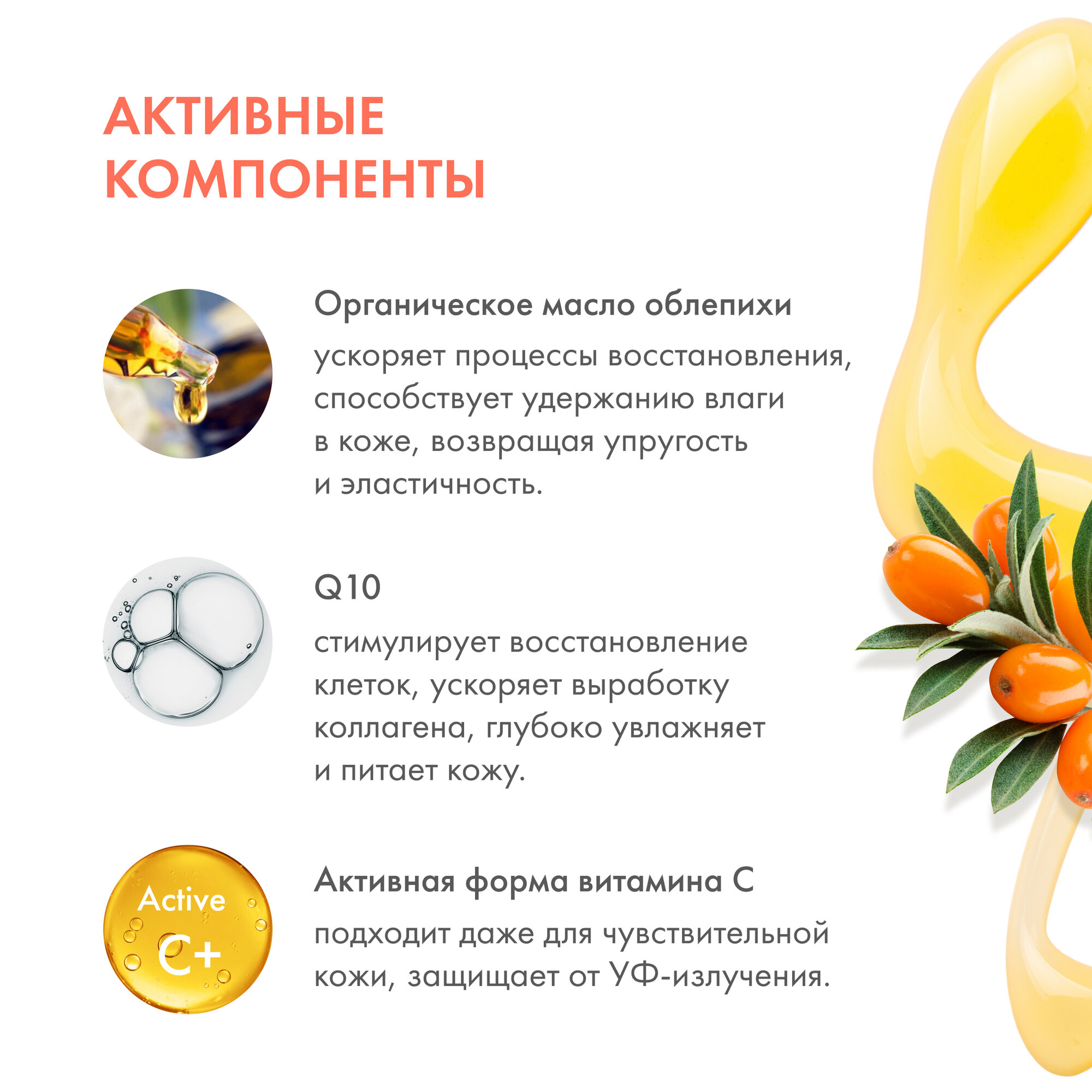 Органическое масло облепихи, благодаря высокому содержанию витамина С, ускоряет процессы восстановления, способствует удержанию влаги в коже, возвращая упругость и эластичность. Активная форма витамина С «Active C+» подходит даже для чувствительной кожи, отлично воздействуя на верхние слои,защищая от УФ-излучения. Q10 - мощный антиоксидант, стимулирует восстановление клеток, ускоряет выработку коллагена, глубоко увлажняя и питая кожу.