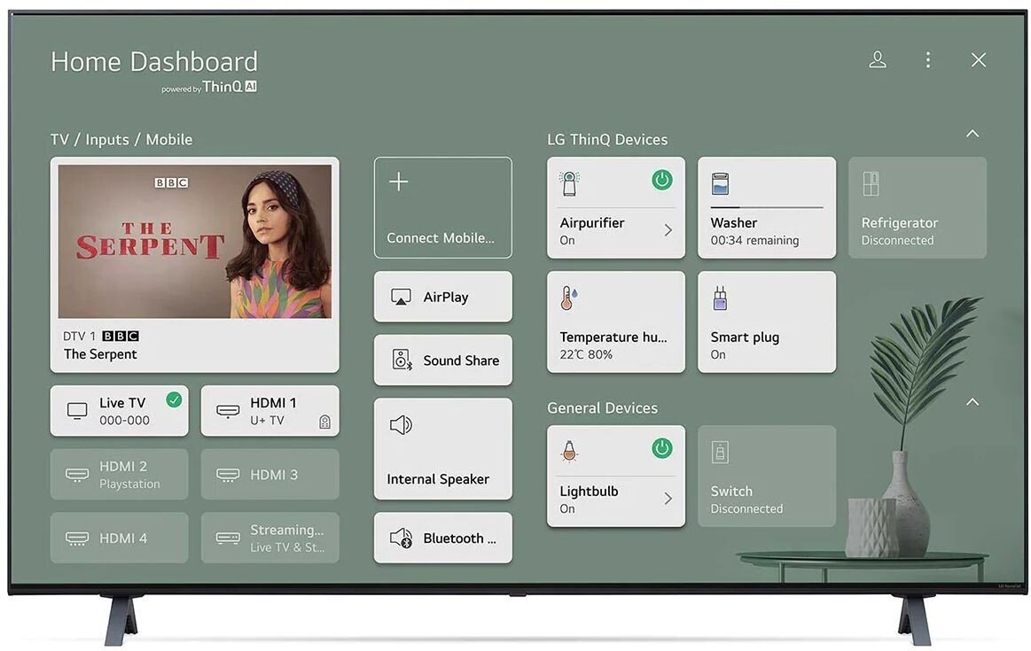 Телевизор относится к серии ThinQ AI (искусственный интеллект). Система естественного распознавания голоса позволяет контролировать всю IoT-экосистему и управлять телевизором используя любимую технологию голосового помощника.