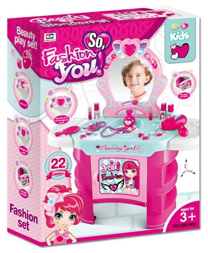 В комплекте: столик- 1 шт., зеркало - 1 шт., фен - 1шт., украшения и элементы косметики - 19 эл.