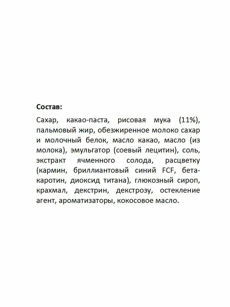 Драже M жиры – 24,7 г; углеводы – 61 г. Энергетическая ценность (100 г): 511 ккал / 2140 кДж.