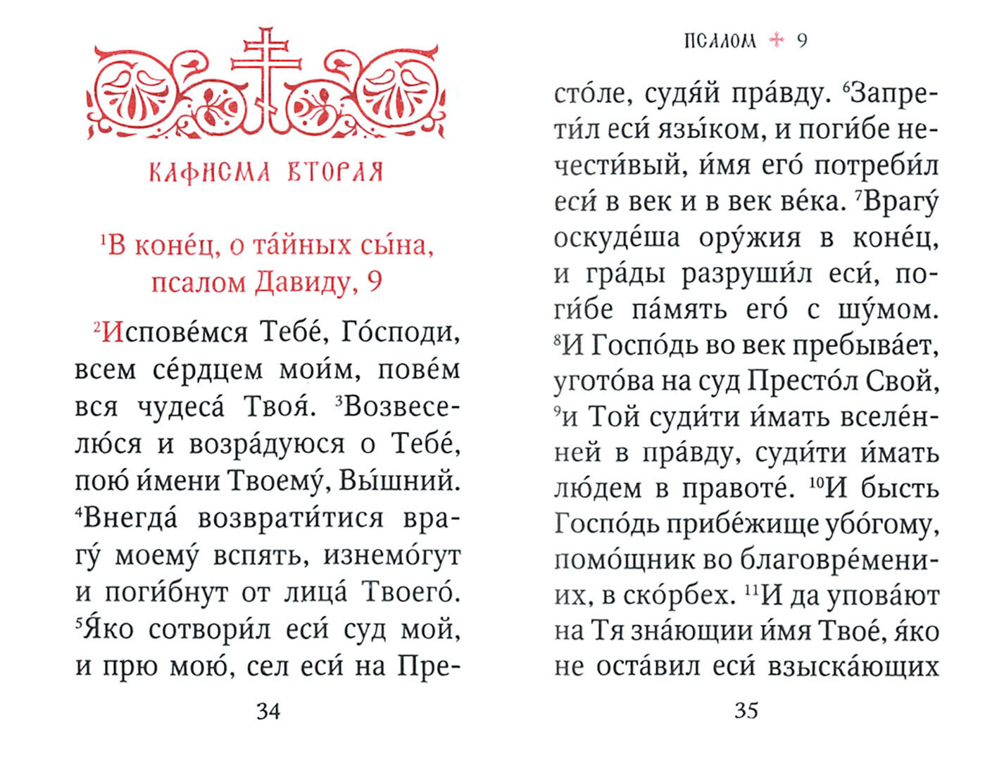 Книга издана с большой любовью. От обложки до последней странички с выходными данными - все ОЧЕНЬ красиво. Отбивки кафисм, названия псалмов, буквицы и структурные элементы внутри молитв напечатаны красным. Псалтирь сдержанно декорирована, это изящное и стильное издание, как и подобает книге такого уровня. Псалмы Давида в лучшем для меня исполнении. У меня это третья книга издательства Сретенского монастыря.
