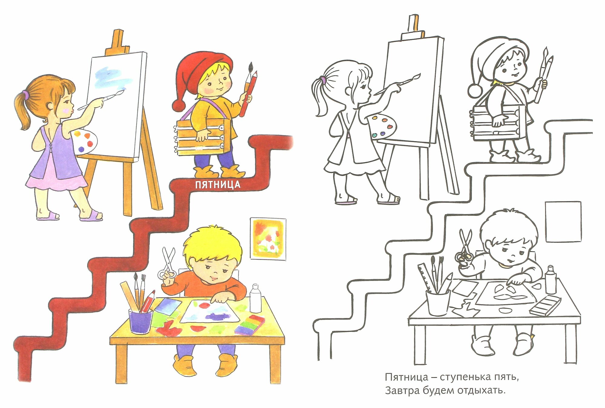 Очень понравилась идея, представленная в этой раскраске для изучения порядка и названий дней недели. Всего здесь 7 картинок для раскрашивания, на каждый день недели по одной. Они объединены сквозным сюжетом (стихотворением) и образом гномика, который с понедельника по субботу поднимается по ступенькам лестницы (например: "Пятница - ступенька пять, завтра будем отдыхать"), а в воскресенье весело скатывается по горке вниз ("В воскресенье отдохнем и неделю вновь начнем"). Однозначно рекомендую.