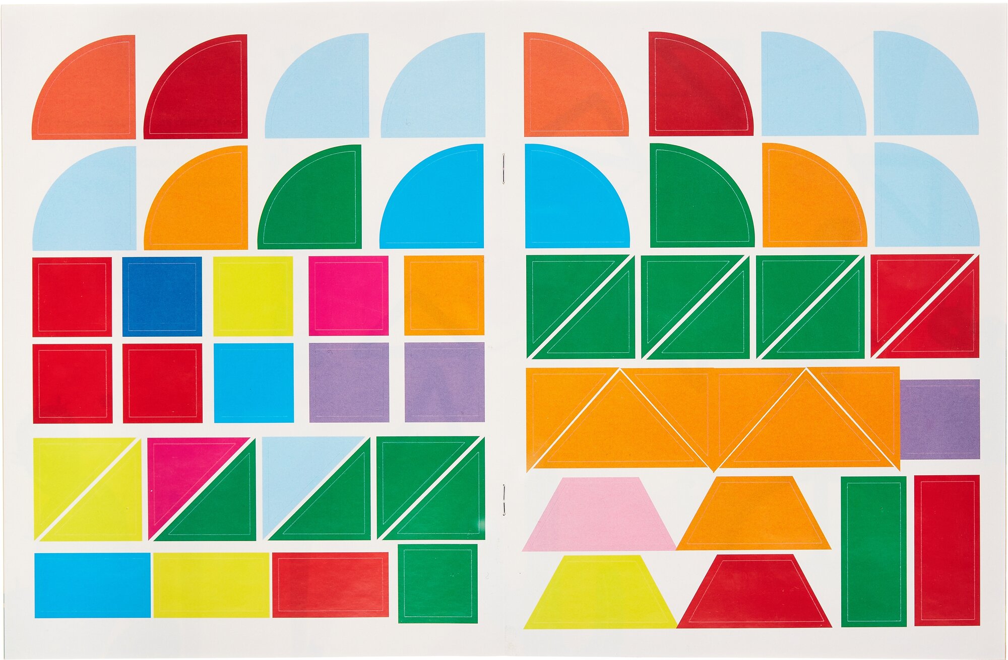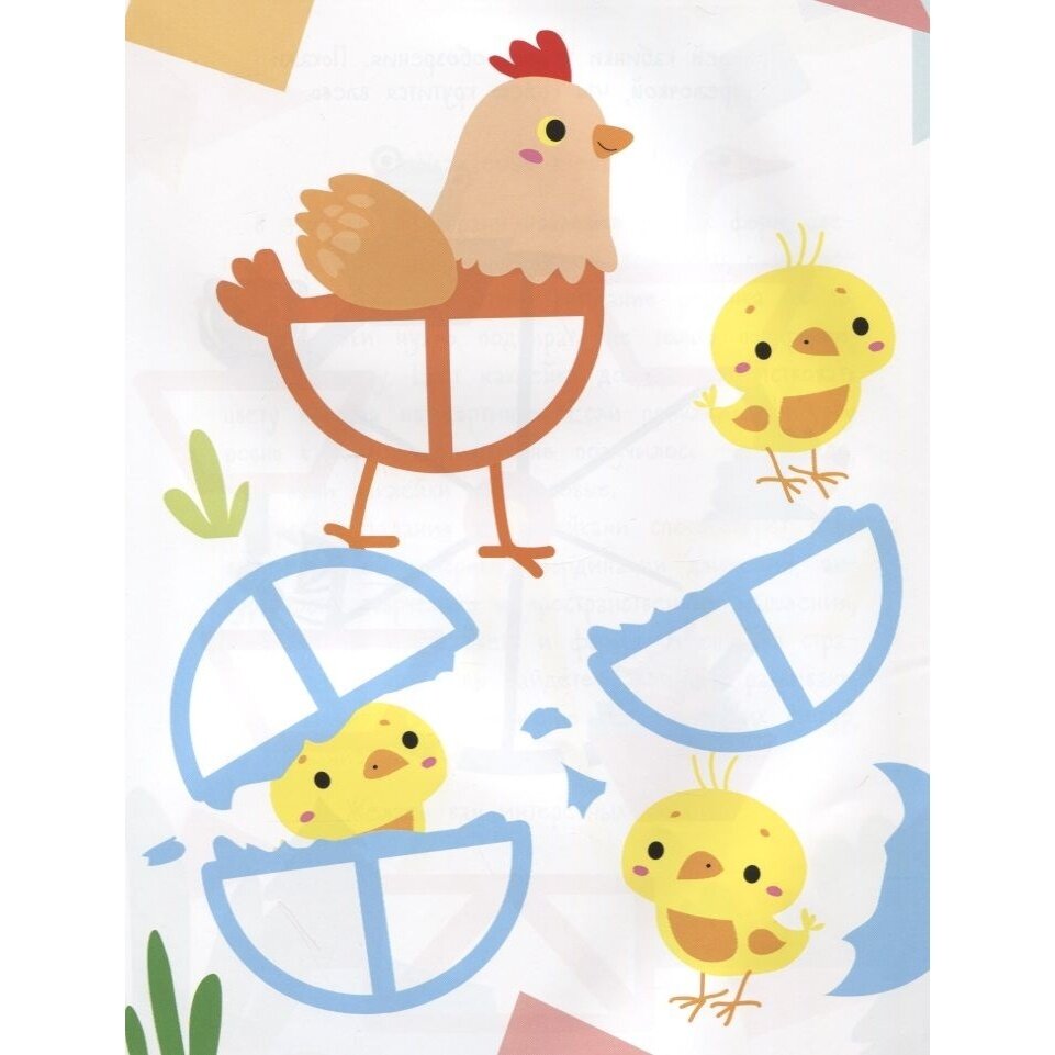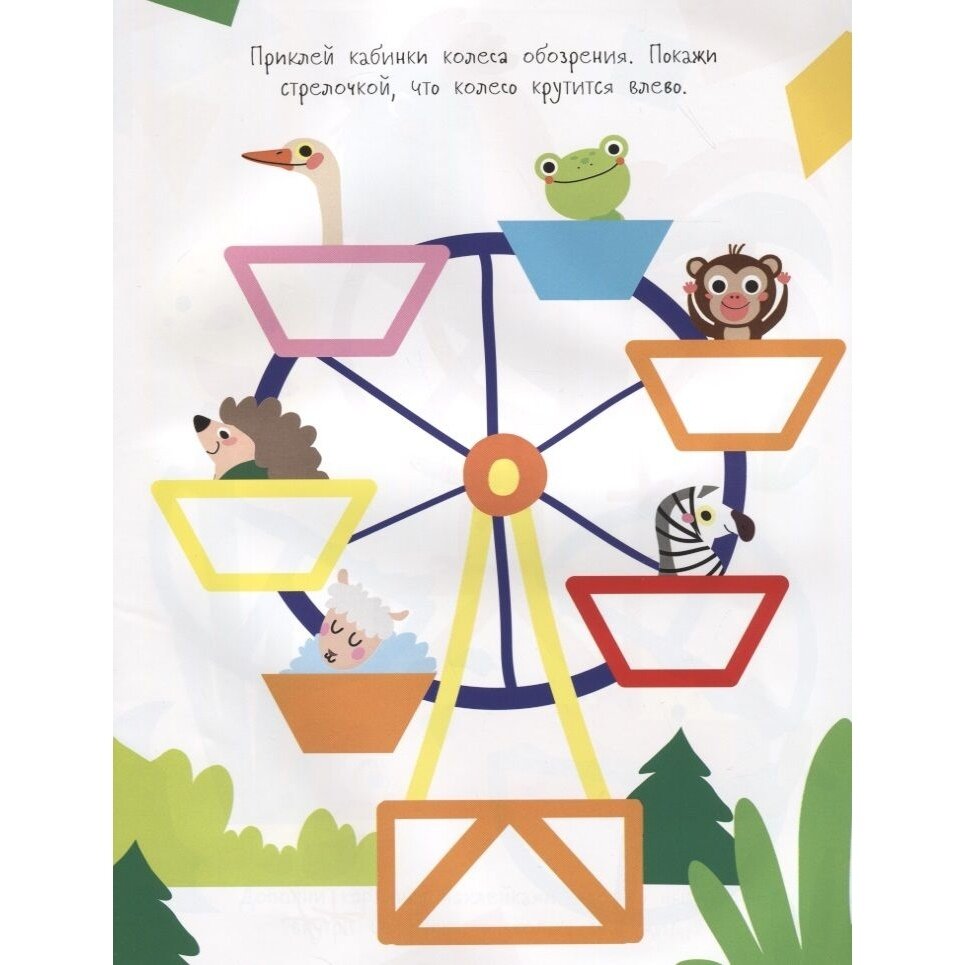В этой книге собраны наклейки разных форм, цветов и размеров. Малыш должен дополнить с их помощью картинки. Обратите внимание ребёнка на то, что наклейки нужно подбирать не только по форме, но и по цвету. Цвет наклейки должен соответствовать цвету контура на картинке. Если приклеить фигурку ровно с первой попытки не получилось - не беда, ведь наши наклейки многоразовые.