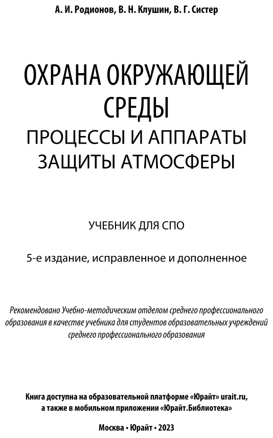 Охрана окружающей среды процессы и аппараты защиты атмосферы Учебник (Родионов Анатолий Иванович; Клушин Виталий Николаевич; Систер Владимир Григорьевич); ЮРАЙТ, 2019