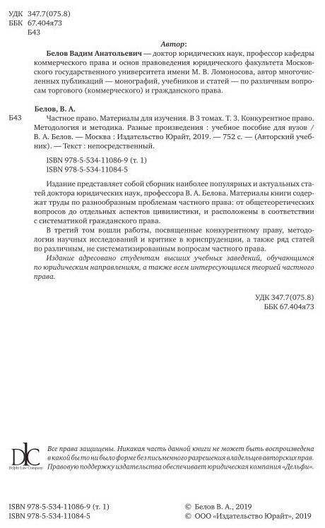Издание представляет собой сборник наиболее популярных и актуальных статей доктора юридических наук, профессора В. А. Белова, до сих пор существовавших только в форме журнальных публикаций. Материалы книги содержат труды по разнообразным проблемам частного права: от общетеоретических вопросов до отдельных аспектов цивилистики, и расположены в соответствии с систематикой гражданского права. В третий том вошли работы, посвященные конкурентному праву, методологии научных исследований в юриспруденции и проблемам критики.