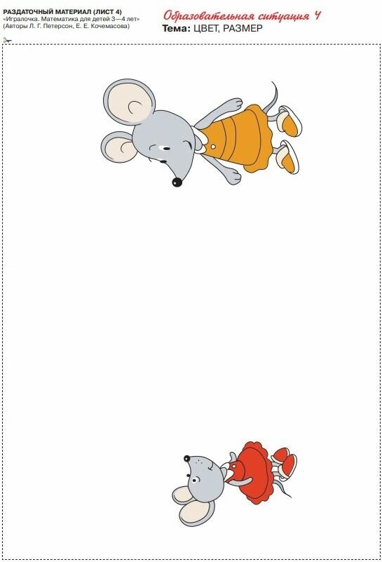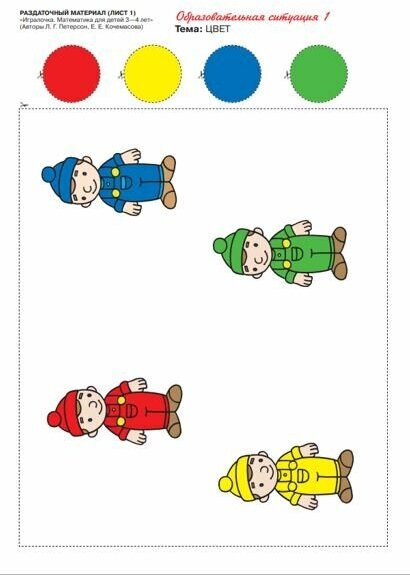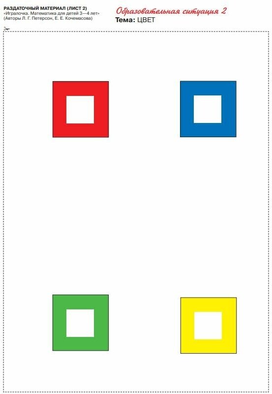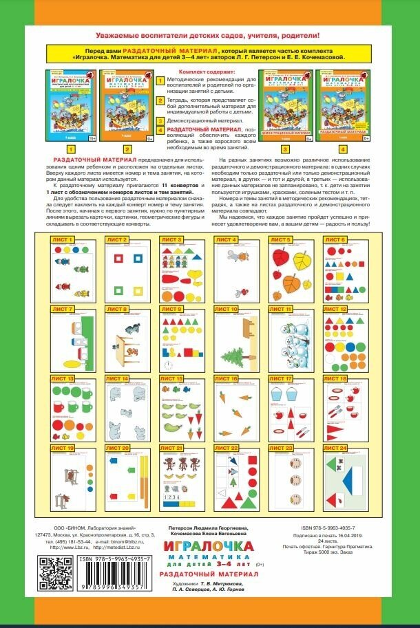 Перед вами раздаточный материал, который является частью комплекта "Игралочка. Математика для детей 3 - 4 лет" авторов Л. Г. Петерсон и Е. Е. Кочемасовой. Комплект содержит: - Методические рекомендации для воспитателей и родителей по организации занятий с детьми - Тетрадь, которая представляет собой дополнительный материал для индивидуальной работы с детьми - Демонстрационный материал (24 листа) - Раздаточный материал, позволяющий обеспечить каждого ребенка, а также взрослого всем необходимым во время занятий. Раздаточный материал предназначен для использования одним ребенком и расположен на отдельных листах. Вверху каждого листа имеется номер и тема занятия, на котором данный материал используется. К раздаточному материалу прилагаются 12 конвертов и 1 лист с обозначением номеров листов и тм занятий. Для удобства пользования раздаточным материалом сначала следует наклеить на каждый конверт номер и тему занятия. После этого, начиная с первого занятия нужно по пунктирным линиям вырезать карточки, картинки, геометрические фигуры и складывать в соответствующие конверты. На разных занятиях возможно различное использование раздаточного и демонстрационного материала: в одних случаях необходим только раздаточный или только демонстрационный материал, в других - и тот и другой, в третьих - использование данных материалов не запланировано, т.к. дети на занятии пользуются игрушками, красками, соленым тестом и т.п. Номера и темы занятий в методических рекомендациях, тетрадях, а также на листах раздаточного и демонстрационного материала совпадают. Мы надеемся, что каждое занятие пройдет успешно и принесет удовлетворение вам, а вашим детям - радость и пользу!